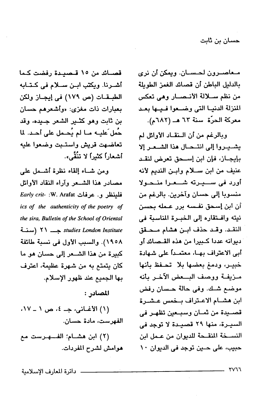 ومن شاء إلقاء نظرة أشمل على مصادر هذا الشعر وآراء النقاد الأوائل فلينظر و. عرفات Early crit-: W. Arafat ics of the authenticity of the poetry of the sira, Bulletin of the School of Oriental studies London Institute جـ 21 (سنة 1958). والسبب الأول فى نسبة طائفة كبيرة من هذا الشعر إلى حسان هو ما كان يتمتع به من شهرة عظيمة، اعترف بها الجميع عند ظهور الإسلام.