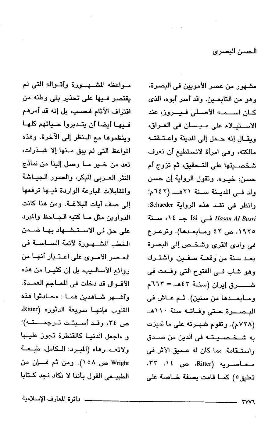 مشهور من عصر الأمويين فى البصرة، وهو من التابعين. وقد أسر أبوه، الذى كان اسمه الأصلى فيروز، عند الاستيلاء على ميسان فى العراق، ويقال إنه حمل إلى المدينة واعتقته مالكته، وهى امرأة لا نستطيع أن نعرف شخصيتها على التحقيق، ثم تزوج أم حسن: خيره. وتقول الرواية إن حسن ولد فى المدينة سنة 21 هـ (642 م؛ وانظر فى نقد هذه الرواية Schaeder: Hasan Al Basri , فى ISl جـ 14، سنة 1925، ص 42 وما بعدها). وترعرع فى وادى القرى وشخص إلى البصرة بعد سنة من وقعة صفين. واشترك وهو شاب فى الفتوح التى وقعت فى شرق إيران (سنة 43 هـ = 663 م وما بعدها من سنين). ثم عاش فى البصرة حتى وفاته سنة 110 هـ (728 م). وتقوم شهرته على ما تميزت به شخصيته فى الدين من صدق واستقامة، مما كان له عميق الأثر فى معاصريه (Ritter، ص 14، 33، تعليق 5) كما قامت بصفة خاصة على مواعظه المشهورة وأقواله التى لم يقتصر فيها على تحذير بنى وطنه من اقتراف الآثام فحسب، بل إنه قد أمرهم فيها أيضا أن يتدبروا حياتهم كلها وينظموها مع النظر الى الآخرة. وهذه المواعظ التى لم يبق منها إلا شذرات، تعد من خير ما وصل إلينا من نماذج النثر العربى المبكر، والصور الجياشة والمقابلات البارعة الواردة فيها ترفعها إلى صف آيات البلاغة. ومن هنا كانت الدواوين مثل ما كتبه الجاحظ والمبرد على حق فى الاستشهاد بها ضمن الخطب المشهورة لأئمة الساسة فى العصر الأموى على اعتبار أنها من روائع الأساليب، بل إن كثيرا من هذه الأقوال قد دخلت فى المعاجم العمدة. وأشهر شاهدين هما: "حادثوا هذه القلوب فإنها سريعة الدثور" (Ritter, ص 24، وقد أسيئت ترجمته)؛ و"اجعل الدنيا كالقنطرة تجوز عليها ولا تعمرها" (المبرد: الكامل، طبعة Wright ص 158). ومن ثم فإن من الطبيعى القول بأننا لا نكاد نجد كتابا