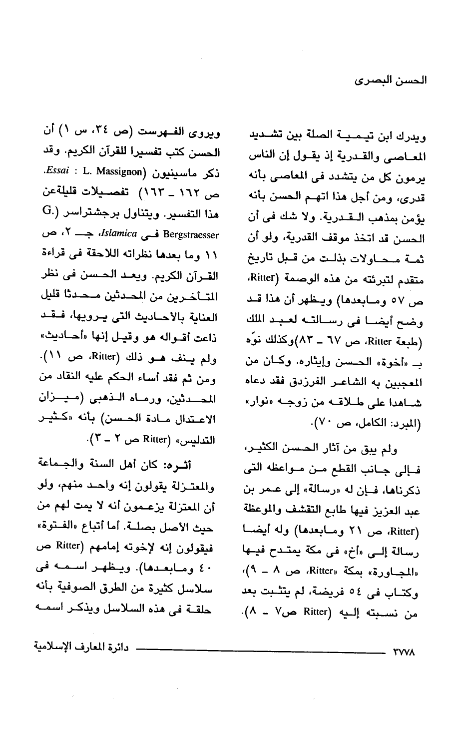 ويدرك ابن تيمية الصلة بين تشديد المعاصى والقدرية إذ يقول إن الناس يرمون كل من يتشدد فى المعاصى بأنه قدرى، ومن أجل هذا اتهم الحسن بأنه يؤمن بمذهب القدرية. ولا شك فى أن الحسن قد اتخذ موقف القدرية، ولو أن ثمة محاولات بذلت من قبل تاريخ متقدم لتبرئته من هذه الوصمة (Ritter, ص 57 وما بعدها) ويظهر أن هذا قد وضع أيضا فى رسالته لعبد الملك (طبعة Ritter، ص 67 - 83) وكذلك نوّه بـ "أخوة" الحسن وإيثاره. وكان من المعجبين به الشاعر الفرزدق فقد دعاه شاهدا على طلاقه من زوجه "نوار" (المبرد: الكامل، ص 70).