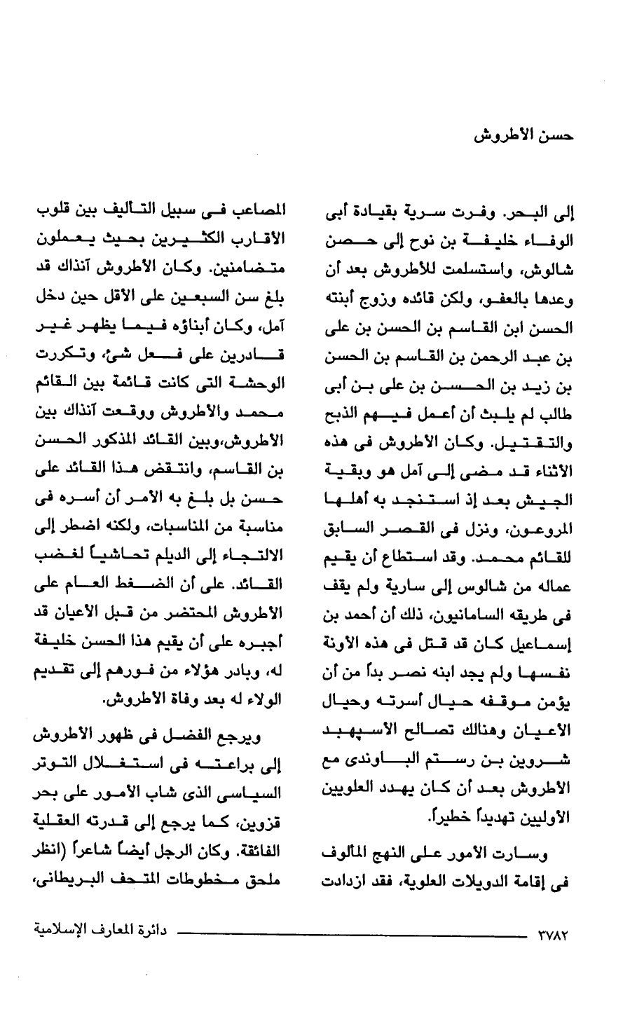 الى البحر. وفرت سرية بقيادة أبى الوفاء خليفة بن نوح الى حصن شالوش، واستسلمت للأطروش بعد أن وعدها بالعفو، ولكن قائده وزوج ابنته الحسن ابن القاسم بن الحسن بن على بن عبد الرحمن بن القاسم بن الحسن بن زيد بن الحسن بن على بن أبى طالب لم يلبث أن أعمل فيهم الذبح والتقتيل. وكان الأطروش فى هذه الأثناء قد مضى إلى آمل هو وبقية الجيش بعد إذ استنجد به أهلها المروعون، ونزل فى القصر السابق للقائم محمد. وقد استطاع أن يقيم عماله من شالوس إلى سارية ولم يقف فى طريقه السامانيون، ذلك أن احمد بن إسماعيل كان قد قتل فى هذه الأونة نفسها ولم يجد ابنه نصر بدًا من أن يؤمن موقفه حيال أسرته وحيال الأعيان وهنالك تصالح الأسيهبد شروين بن رستم الباوندى مع الأطروش بعد أن كان يهدد العلويين الأوليين تهديدًا خطيرًا.