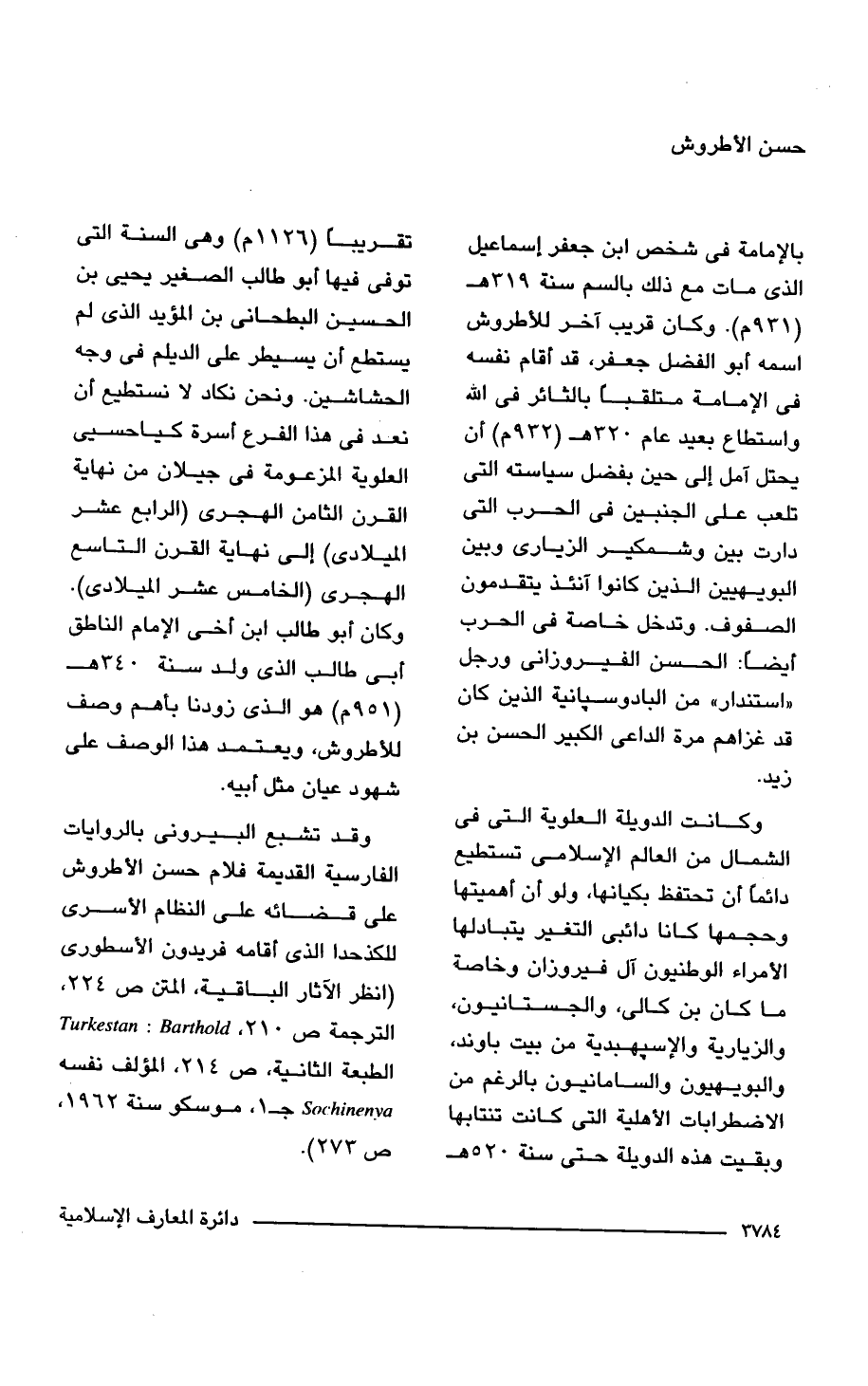 وقد تشبع البيرونى بالروايات الفارسية القديمة فلام حسن الأطروش على قضائه على النظام الأسرى للكذحدا الذى أقامه فريدون الأسطورى (انظر الآثار الباقية، المتن ص 224، الترجمة ص 210، Turkestan: Barthold الطبعة الثانية، ص 214، المؤلف نفسه Sochinenya جـ 1، موسكو سنة 1962، ص 273).