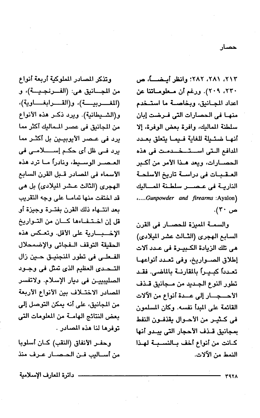 213، 281، 282؛ وانظر أيضًا، ص 230، 209). ورغم أن معلوماتنا عن أعداد المجانيق، وبخاصة ما استخدم منها في الحصارات التى فرضت إبان سلطنة المماليك، وافرة بعض الوفرة، إلا أنها ضئيلة للغاية فيما يتعلق بعدد المدافع التى استخدمت في هذه الحصارات، ويعد هذا الأمر من أكبر العقبات في دراسة تاريخ الأسلحة النارية في عصر سلطنة المماليك (Gunpowder and firearms: Ayalon .... , ص 30).
