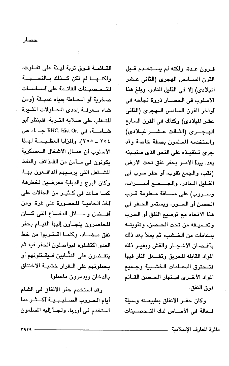 قرون عدة، ولكنه لم يستخدم قبل القرن السادس الهجرى (الثانى عشر الميلادى) إلا في القليل النادر، وبلغ هذا الأسلوب في الحصار ذروة نجاحه في أواخر القرن السادس الهجرى (الثانى عشر الميلادى) وكذلك في القرن السابع الهجرى (الثالث عشر الميلادى) واستخدمه المسلمون بصفة خاصة وقد جرى تنفيذه على النحو الذى سنبينه بعد. يبدأ الأمر بحفر نفق تحت الأرض (نقب، والجمع نقوب، أو حفر سرب في القليل النادر، والجمع أسراب، وسروب) على مسافة معلومة قرب الحصن أو السور، ويستمر الحفر في هذا الاتجاه مع توسيع النفق أو السرب وتعميقه من تحت الحصن، وتقويته بدعامات من الخشب، ثم يملأ بعد ذلك بأغصان الأشجار والقش وبغير ذلك المواد القابلة للحريق وتشعل النار فيها فتحترق الدعامات الخشبية وجميع المواد الأخرى فينهار الحصن القائم فوق النفق.