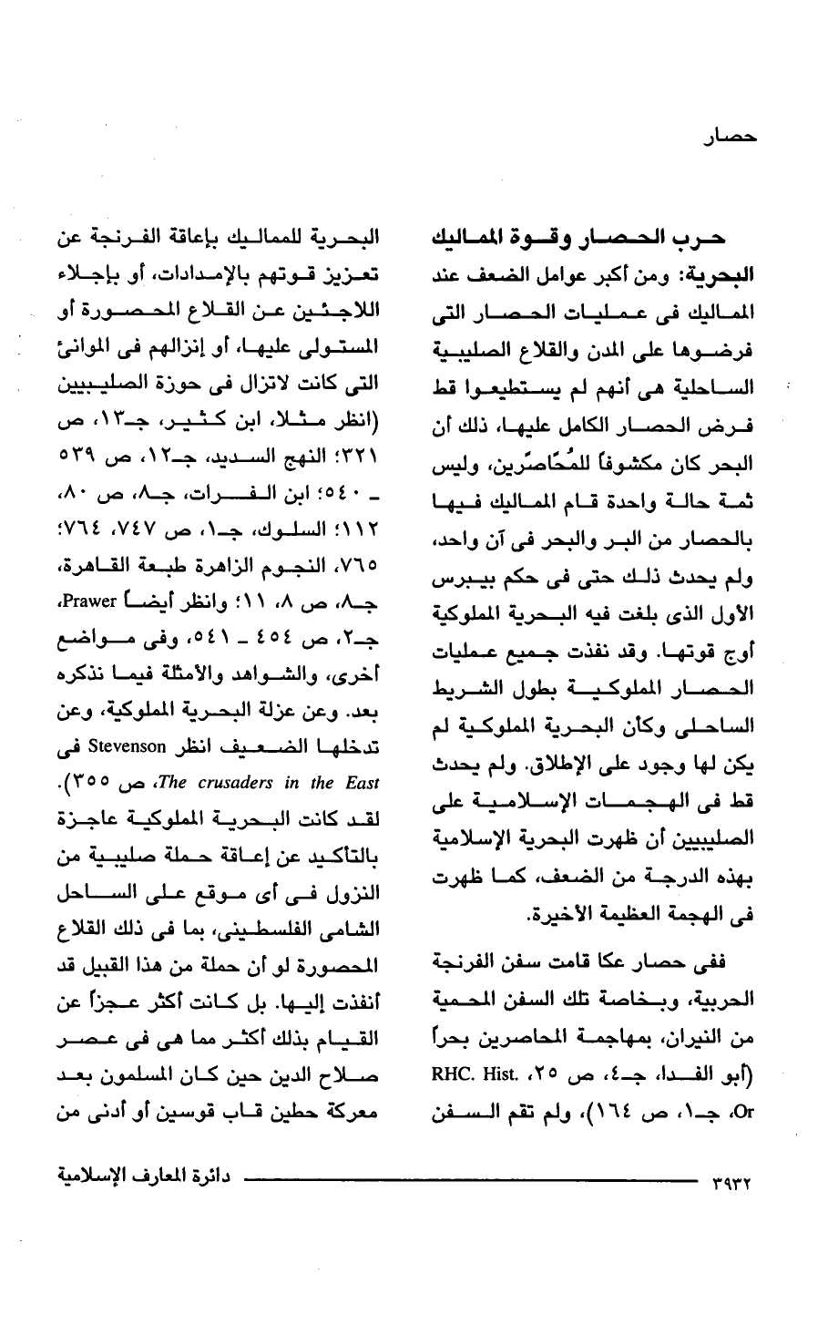 ففى حصار عكا قامت سفن الفرنجة الحربية، وبخاصة تلك السفن المحمية من النيران، بمهاجمة المحاصرين بحرًا (أبو الفدا، جـ 4، ص 25, RHC. Hist Or، جـ 1، ص 164)، ولم تقم السفن البحرية للمماليك بإعاقة الفرنجة عن تعزيز قوتهم بالإمدادات، أو بإجلاء اللاجئين عن القلاع المحصورة أو المستولى عليها، أو إنزالهم في الموانئ التى كانت لا تزال في حوزة الصليبيين (انظر مثلا، ابن كثير، جـ 13، ص 321؛ النهج السديد، جـ 12، ص 539 - 540؛ ابن الفرات، جـ 8، ص 80، 112؛ السلوك، جـ 1، ص 747، 764؛ 765، النجوم الزاهرة طبعة القاهرة، جـ 8، ص 8، 11؛ وانظر أيضًا prawer, جـ 2، ص 454 - 541، وفى مواضع أخرى، والشواهد والأمثلة فيما نذكره بعد. وعن عزلة البحرية المملوكية، وعن تدخلها الضعيف انظر Stevenson في The crusaders in the East، ص 355). لقد كانت البحرية المملوكية عاجزة بالتأكيد عن إعاقة حملة صليبية من النزول في أى موقع على الساحل الشامى الفلسطينى، بما في ذلك القلاع المحصورة لو أن حملة من هذا القبيل قد أنفذت إليها. بل كانت أكثر عجزًا عن القيام بذلك أكثر مما هى في عصر صلاح الدين حين كان المسلمون بعد معركة حطين قاب قوسين أو أدنى من