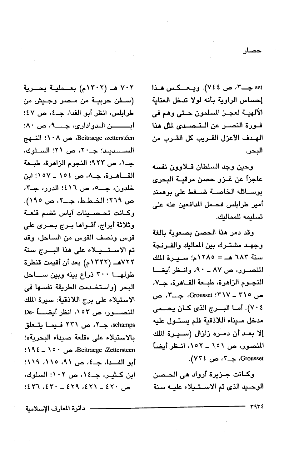 وكانت جزيرة أرواد هى الحصن الوحيد الذى تم الاستيلاء عليه سنة 702 هـ (1302 م) بعملية بحرية (سفن حربية من مصر وجيش من طرابلس، انظر أبو الفدا، جـ 4، ص 47؛ ابن الدوادارى، جـ 9، ص 80؛ Beitraege. zettersteen, ص 108؛ النهج السديد؛ جـ 20، ص 21؛ السلوك، جـ 1، ص 923؛ النجوم الزاهرة، طبعة القاهرة، جـ 8، ص 154 - 157؛ ابن خلدون، جـ 5، ص 416؛ الدرر، جـ 3، ص 269؛ الخطط، جـ 2، ص 195). وكانت تحصينات آياس تضم قلعة وثلاثة أبراج، أقواها برج بحرى على قوس ونصف القوس من الساحل، وقد تم الاستيلاء على هذا البرج سنة 722 هـ (1322 م) بعد أن أقيمت قنطرة طولها 300 ذراع بينه وبين ساحل البحر (واستخدمت الطريقة نفسها في الاستيلاء على برج اللاذقية: سيرة الملك المنصور، ص 153، انظر أيضًا De- schamps، جـ 2، ص 231 فيما يتعلق بالاستيلاء على "قلعة صيداء البحرية"؛ Beitraege, Zettersteen، ص 150 - 194؛ أبو الفدا، جـ 4، ص 91، 115، 119؛ ابن كثير، جـ 14، ص 102؛ السلوك، ص 420 - 421، 429 - 430، 436؛