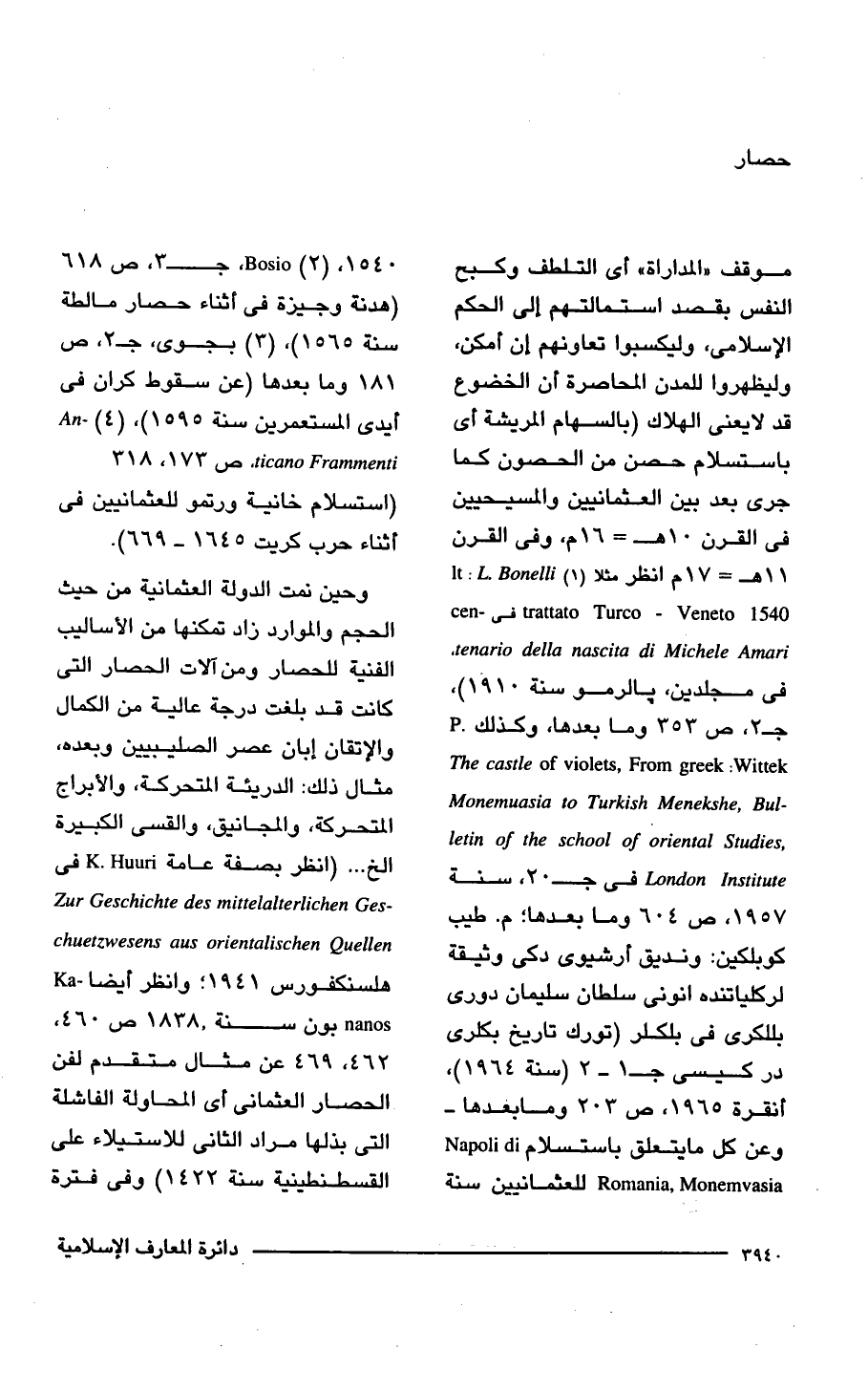 وحين نمت الدولة العثمانية من حيث الحجم والموارد زاد تمكنها من الأساليب الفنية للحصار ومن آلات الحصار التى كانت قد بلغت درجة عالية من الكمال والإتقان إبان عصر الصليبيين وبعده، مثال ذلك: الدريئة المتحركة، والأبراج المتحركة، والمجانيق، والقسى الكبيرة الخ ... (انظر بصفة عامة K. Huuri في - Zur Geschichte des mittelalterlichen Ges chuetzwesens aus orientalischen Quellen هلسنكفورس 1941؛ وانظر أيضًا ka- nanos بون سنة 1838 ص 460، 462، 469 عن مثال متقدم لفن الحصار العثمانى أى المحاولة الفاشلة التي بذلها مراد الثانى للاستيلاء على القسطنطينية سنة 1422) وفى فترة