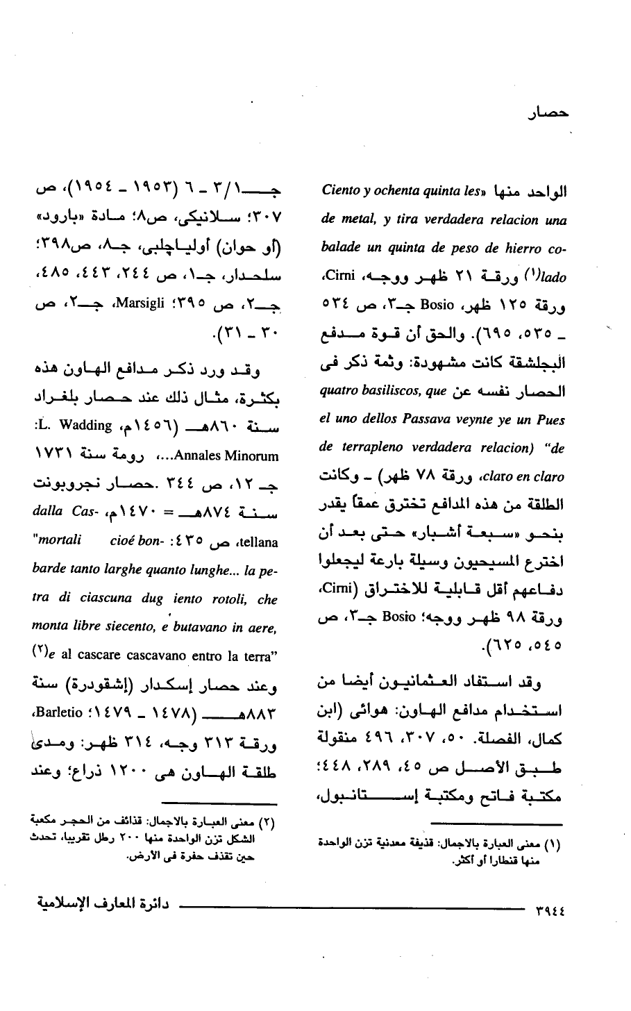 وقد ورد ذكر مدافع الهاون هذه بكثرة، مثال ذلك عند حصار بلغراد سنة 860 هـ (1456 م، L. Wadding: Annales Minorum ... .، رومة سنة 1731 جـ 12، ص 344. حصار نجروبونت سنة 874 هـ = 1470 م dalla Cas- tellana ص 435: - mortali cioe bon" - barde tanto larghe quanto lunghe ... la pe tra di ciascuna dug iento rotoli, che monta libre siecento, e butavano in aere, e al cascare cascavano entro la terra" (¬2) وعند حصار إسكدار (إشقودرة) سنة 883 هـ (1478 - 1479؛ Barletio, ورقة 313 وجه، 314 ظهر: ومدى طلقة الهاون هى 1200 ذراع؛ وعند