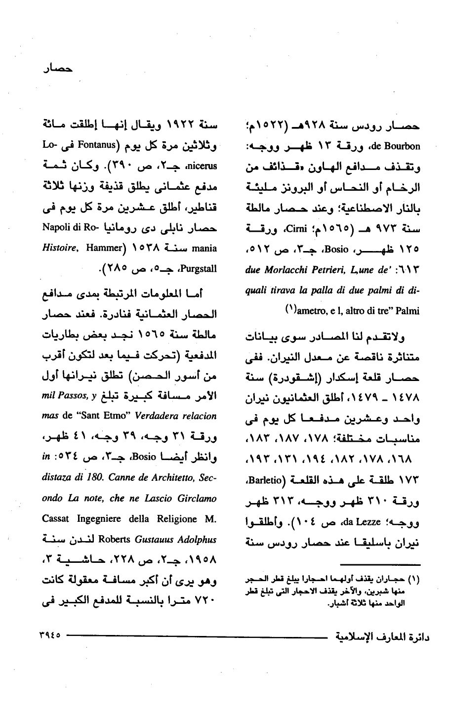 حصار رودس سنة 928 هـ (1522 م؛ de Bourbon، ورقة 13 ظهر ووجه: وتقذف مدافع الهاون "قذائف من الرخام أو النحاس أو البرونز مليئة بالنار الاصطناعية؛ وعند حصار مالطة سنة 973 هـ (1565 م؛ Cirni، ورقة 125 ظهر، Bosio، جـ 3، ص 512، 613: due Morlacchi Petrieri,L,une de' quali tirava la palla di due palmi di di- ametro, el, altro di tre" palmi (¬1)