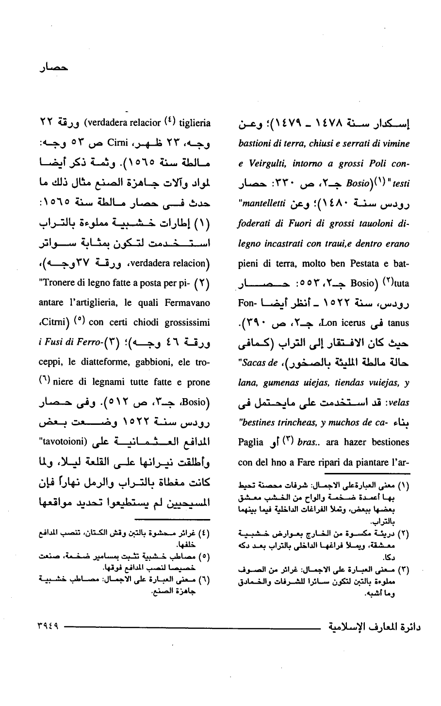 إسكدار سنة 1478 - 1479)؛ وعن bastioni di terra, chiusi e serrati di vimine -e Veirgulti, intorno a grossi Poli con "testi (¬1) (Bosio جـ 2، ص 330: حصار رودس سنة 1480)؛ وعن mantelletti" foderati di Fuori di grossi tauoloni di- legno incastrati con traui,e dentro erano pieni di terra, molto ben Pestata e bat- tuta (¬2) (Bosio جـ 2، 553: حصار رودس، سنة 1522 - انظر أيضًا fon- tanus في Lon icerus، جـ 2، ص 390). حيث كان الافتقار إلى التراب (كما فى حالة مالطة المليئة بالصخور)، sacas de" lana, gumenas uiejas, tiendas vuiejas, y velas: قد استخدمت على ما يحتمل في بناء - bestines trincheas, y muchos de ca" bras .. ara hazer bestiones (¬3) أو Paglia con del hno a Fare ripari da piantare l'ar- verdadera relacior (¬4) tiglieria) ورقة 22 وجه، 23 ظهر، Cirni ص 53 وجه: مالطة سنة 1565). وثمة ذكر أيضًا لمواد وآلات جاهزة الصنع مثال ذلك ما حدث في حصار مالطة سنة 1565: (1) إطارات خشبية مملوءة بالتراب استخدمت لتكون بمثابة سواتر (verdadera relacion، ورقة 37 وجه)، (2) - Tronere di legno fatte a posta per pi" antare l'artiglieria, le quali Fermavano con certi chiodi grossissimi (¬5) (Citrni ورقة 46 وجه)؛ (3) i Fusi di ferro- ceppi, le diatteforme, gabbioni, ele tro- niere di legnami tutte fatte e prone (¬6) (Bosio، جـ 3، ص 512). وفى حصار رودس سنة 1522 وضعت بعض المدافع العثمانية على (tavotoioni" وأطلقت نيرانها على القلعة ليلا، ولما كانت مغطاة بالتراب والرمل نهارًا، فإن المسيحيين لم يستطيعوا تحديد مواقعها