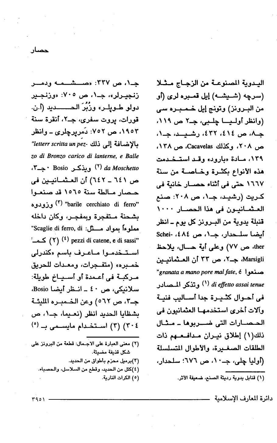 اليدوية المصنوعة من الزجاج مثلا (سرجه (شيشه) إيل قمبره لرى (أو من البرونز) وتونج إيل خمبره سى (وانظر أوليا جلبى، جـ 2 ص 119، جـ 8، ص 414، 432، رشيد، جـ 1، ص 208، وكذلك Cacavelas، ص 138, 139, مادة "بارود" وقد استخدمت هذه الأنواع بكثرة وخاصة من سنة 1667 حتى في أثناء حصار خانية في كريت (رشيد، جـ 1، ص 208: صنع العثمانيون في هذا الحصار 1000 قنبلة يدوية من البرونز كل يوم - انظر أيضًا سلحدار، جـ 1، ص 484، - Schei ther، ص 77) وعلى أية حال، يلاحظ Marsigli، جـ 2، ص 33 أن العثمانيين صنعوا granata a mano pore mal fate, e" di effetto assai tenue (¬1) وتذكر المصادر في أحوال كثيرة جدا أساليب فنية وآلات أخرى استخدمها العثمانيون في الحصارات التى ضربوها - مثال ذلك (1) إطلاق نيران مدافعهم ذات الطلقات الصغيرة، والأطوال المتسلسلة (أوليا جلى، جـ 10، ص 676؛ سلحدار، جـ 1، ص 337: "صشمه ودمر زنجيرلر"، جـ 1، ص 705: "وزنجير دولو طوبلر" وزُبُرَ الحديد (أ. ن. قورات، بروت سفرى، جـ 2، أنقرة سنة 1953، ص 752: دَمِربرجلرى - وانظر بالإضافة إلى ذلك - letterr scritta un pez" zo di Bronzo carico di lanterne. e Balle da Moschetto (¬2) ويذكر Bosio جـ 3، ص 641 - 642) أن العثمانيين في حصار مالطة سنة 1565 قد صنعوا " barile cerchiato di ferro" (¬3) وزودوه بشحنة متفجرة وبمفجر، وكان داخله مملوءًا بمواد مثل: Scaglie di ferro, di" pezzi di catene, e di sassi" (¬4) (2) كما استخدموا ما عرف باسم "كندرلى خمبره" (متفجرات، ومعدات للحريق مركبة في أعمدة أو أسياخ طويلة: سلانيكى، ص 40 - انظر أيضًا Bosio, جـ 3، ص 562) وعن الخمبره المليئة بشظايا الحديد انظر (نعيما، جـ 1، ص 304) (3) استخدام ما يسمى بـ (¬5)