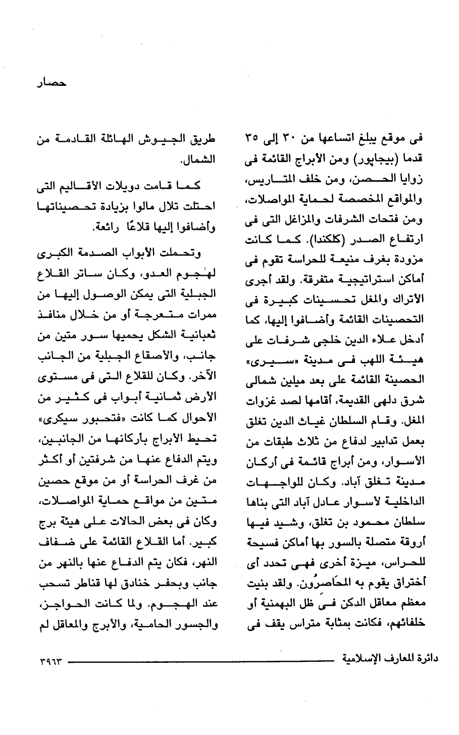في موقع يبلغ اتساعها من 30 إلى 35 قدما (بيجابور) ومن الأبراج القائمة في زوايا الحصن، ومن خلف المتاريس، والمواقع المخصصة لحماية المواصلات، ومن فتحات الشرفات والمزاغل التى في ارتفاع الصدر (كلكندا). كما كانت مزودة بغرف منيعة للحراسة تقوم في أماكن استراتيجية متفرقة. ولقد أجرى الأتراك والمغل تحسينات كبيرة في التحصينات القائمة وأضافوا إليها، كما أدخل علاء الدين بن خلجى شرفات على هيئة اللهب في مدينة "سيرى" الحصينة القائمة على بعد ميلين شمالى شرق دلهى القديمة، أقامها لصد غزوات المغل. وقام السلطان غياث الدين تغلق بعمل تدابير لدفاع من ثلاث طبقات من الأسوار، ومن أبراج قائمة في أركان مدينة تغلق آباد. وكان للواجهات الداخلية لأسوار عادل آباد التي بناها سلطان محمود بن تغلق، وشيد فيها أروقة متصلة بالسور بها أماكن فسيحة للحراس، ميزة أخرى فهى تحدد أى أختراق يقوم به المحَاصِرُون. ولقد بنيت معظم معاقل الدكن في ظل البهمنية أو خلفائهم، فكانت بمثابة متراس يقف في طريق الجيوش الهائلة القادمة من الشمال.