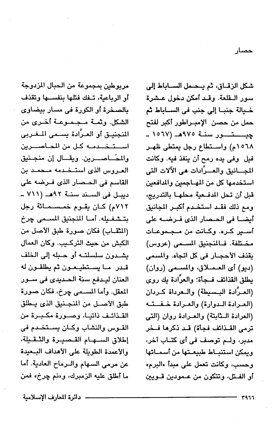 شكل الزقاق، ثم يحمل الساباط إلى سور القلعة. وقد أمكن دخول عشرة خيالة جنبا إلى جنب في الساباط ثم حمل من حصن الإمبراطور أكبر لفتح جيتور سنة 975 هـ (1567 - 1568 م) واستطاع رجل يمتطى ظهر فيل وفى يده رمح أن ينفذ فيه. وكانت المجانيق والعرَّادات هى الآلات التى استخدمها كل من المهاجمين والمدافعين قبل أن تحل المدفعية محلها بالتدريج، ومع ذلك فقد استخدم أكبر المجانيق أيضًا في الحصار الذى فرضه على أسير كره. وكانت من مجموعات مختلفة. فالمنجنيق المسمى (عروس) يقذف الأحجار في كل اتجاه. والمسمى (ديو) أى العملاق، والمسمى (روان) يطلق القذائف فجاة؛ والعرَّادة يك روى (العرَّادة البسيطة) والعرداة كردان (العرادة الدوارة) والعرادة خفته (العرادة الثابتة) والعرادة روان (التى ترمى القذائف فجأة) قد ذكرها فخر مدبر، ولم توصف في أى كتاب آخر، ويمكن استنباط طبيعتها من أسمائها وحسب، وكانت تعمل على مبدأ "البرم" أو الفتل، وتتكون من عمودين قويين مربوطين بمجموعة من الحبال المزدوجة أو الرباعية، تفك فتلها بنفسها وتقذف بالصخرة أو الكورة في مسار بيضاوى، الشكل. وثمة مجموعة أخرى من المنجنيق أو العرَّادة يسمى المغربى استخدمه كل من المحاصرين والمحَاصرين. ويقال إن منجنيق العروس الذى استخدمه محمد بن القاسم في الحصار الذى فرضه على ديبل في السند سنة 92 هـ (711 - 712 م) كان يقوم خمسمائة رجل بتشغيله. أما المنجنيق المسمى جرخ (المثقاب) فكان صورة طبق الأصل من الكبش من حيث التركيب. وكان العمال يشدون سلسلته أو حبله إلى الخلف قدر ما يستطيعون ثم يطلقون له العنان ليدفع سنة الحديدى في سور المعقل. وأما المسمى جرخ، فكان صورة طبق الأصل من المنجنيق الذى يطلق القذائف ذاتيا، وصورة مكبرة من القوس والنشاب وكان يستخدم في إطلاق السهام القصيرة والثقيلة، والأعمدة الطويلة على الأهداف البعيدة عن مرمى السهام والرماح العادية. أما ما أطلق عليه الزمبرك، و"نم جرخ" فمن