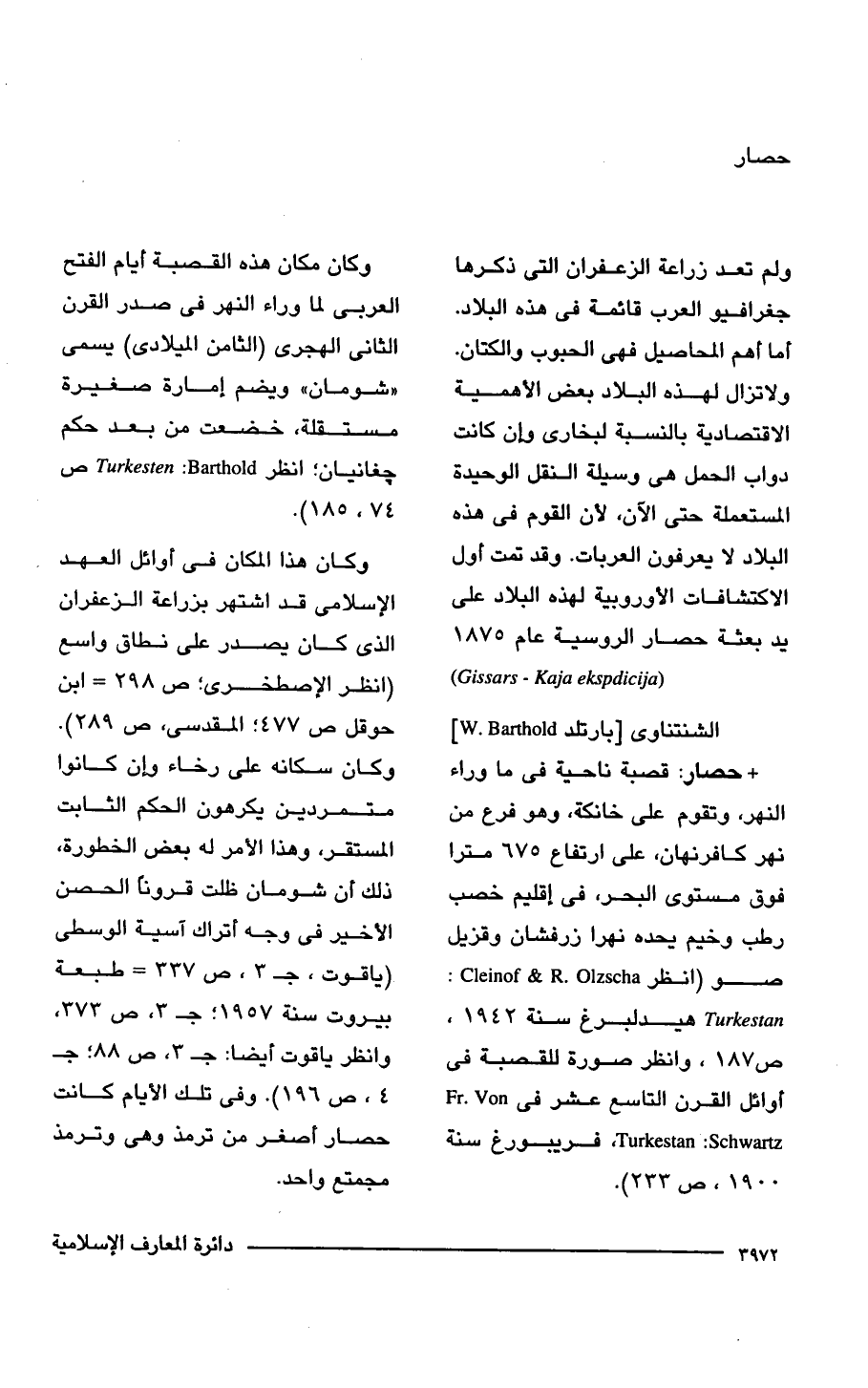 + حصار: قصبة ناحية في ما وراء النهر، وتقوم على خانكة، وهو فرع من نهر كافرنهان، على ارتفاع 675 مترا فوق مستوى البحر، في إقليم خصب رطب وخيم يحده نهرا زرفشان وقزيل صو (انظر Cleinof & R. Olzscha: Turkestan هيدلبرغ سنة 1942، ص 187، وانظر صورة للقصبة في أوائل القرن التاسع عشر في Fr. Von Turkestan: Schwartz, فريبورغ سنة 1900، ص 233).