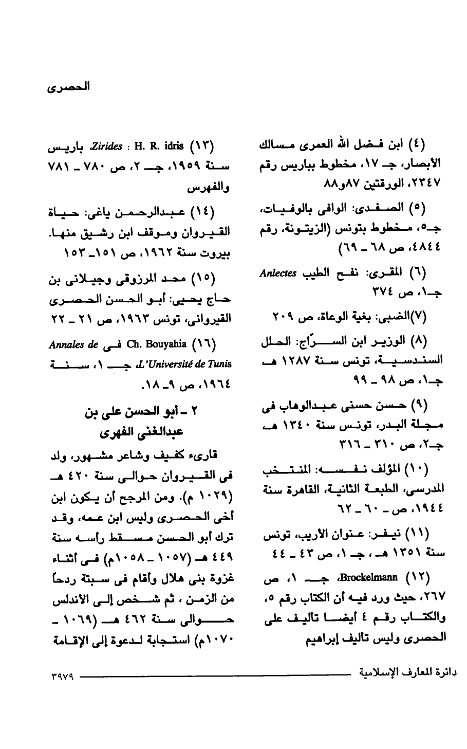 (15) محمد المرزوقى وجيلاني بن حاج يحيى: أبو الحسن الحصرى القيرواني، تونس 1963، ص 21 - 22