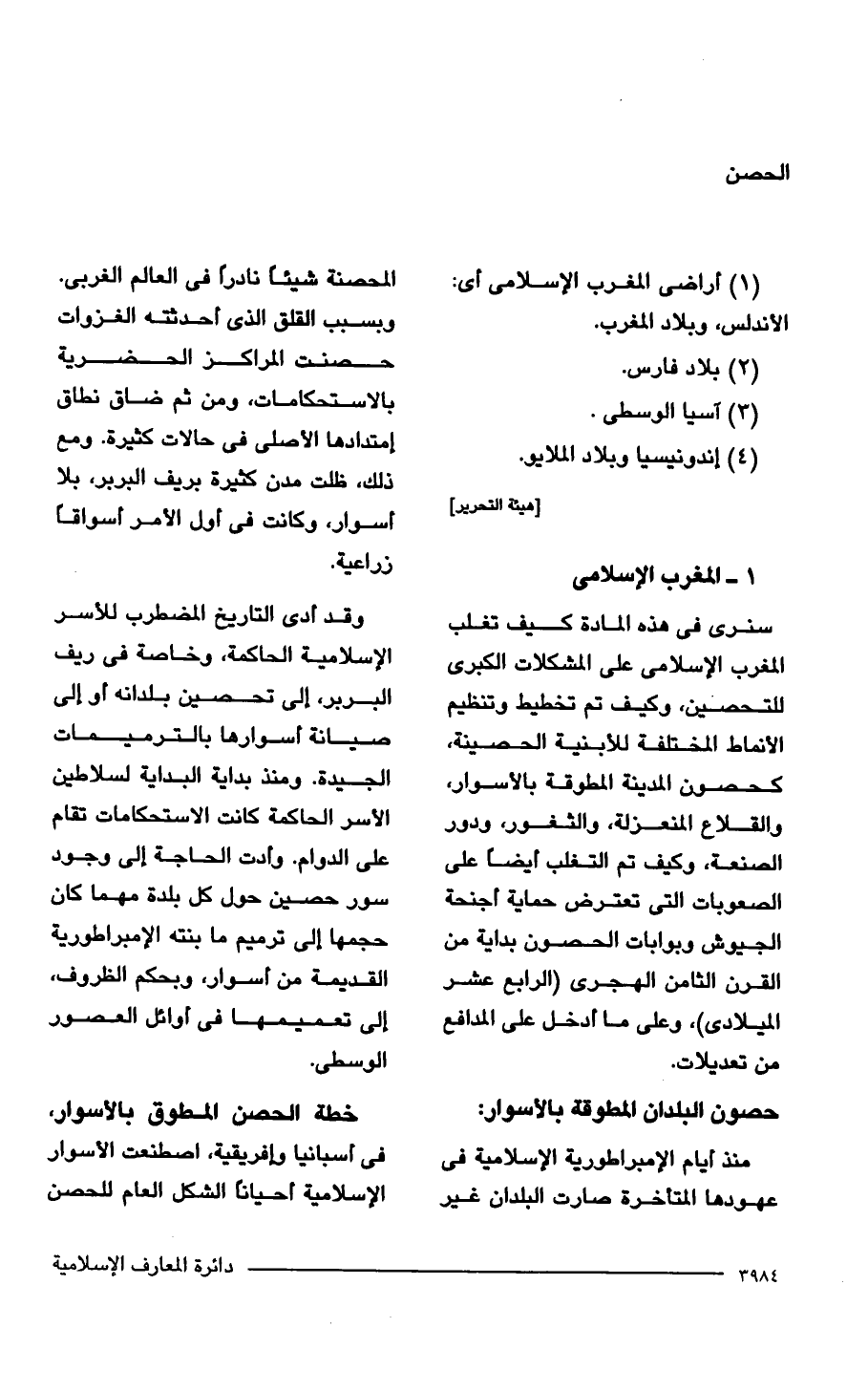 وقد أدى التاريخ المضطرب للأسر الإسلامية الحاكمة، وخاصة في ريف البربر، إلى تحصين بلدانه أو إلى صيانة أسوارها بالترميمات الجيدة. ومنذ بداية البداية لسلاطين الأسر الحاكمة كانت الاستحكامات تقام على الدوام. وأدت الحاجة إلى وجود سور حصين حول كل بلدة مهما كان حجمها إلى ترميم ما بنته الإمبراطورية القديمة من أسوار، وبحكم الظروف، إلى تعميمها في أوائل العصور الوسطى.