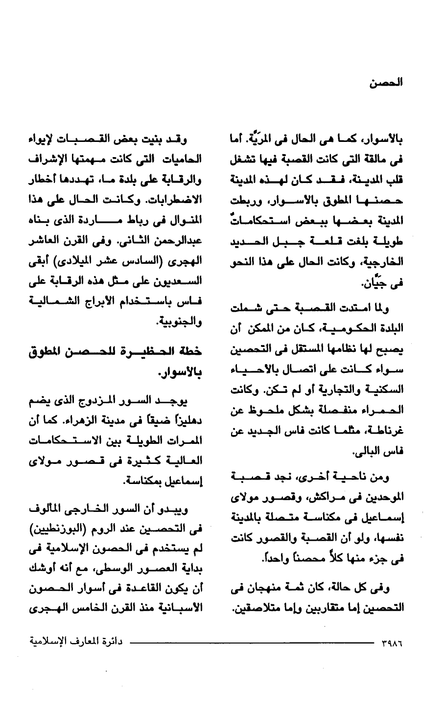 ولما امتدت القصبة حتى شملت البلدة الحكومية، كان من الممكن أن يصبح لها نظامها المستقل في التحصين سواء كانت على اتصال بالأحياء السكنية والتجارية أو لم تكن. وكانت الحمراء منفصلة بشكل ملحوظ عن غرناطة، مثلما كانت فاس الجديد عن فاس البالى.