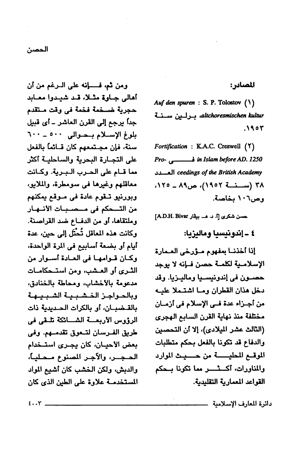 (2) Fortification: K.A.C. Creswell in Islam before AD. 1250 في Pro- ceedings of the British Academy العدد 38 (سنة: 1952)، ص 89 - 125، وص 106 بخاصة.