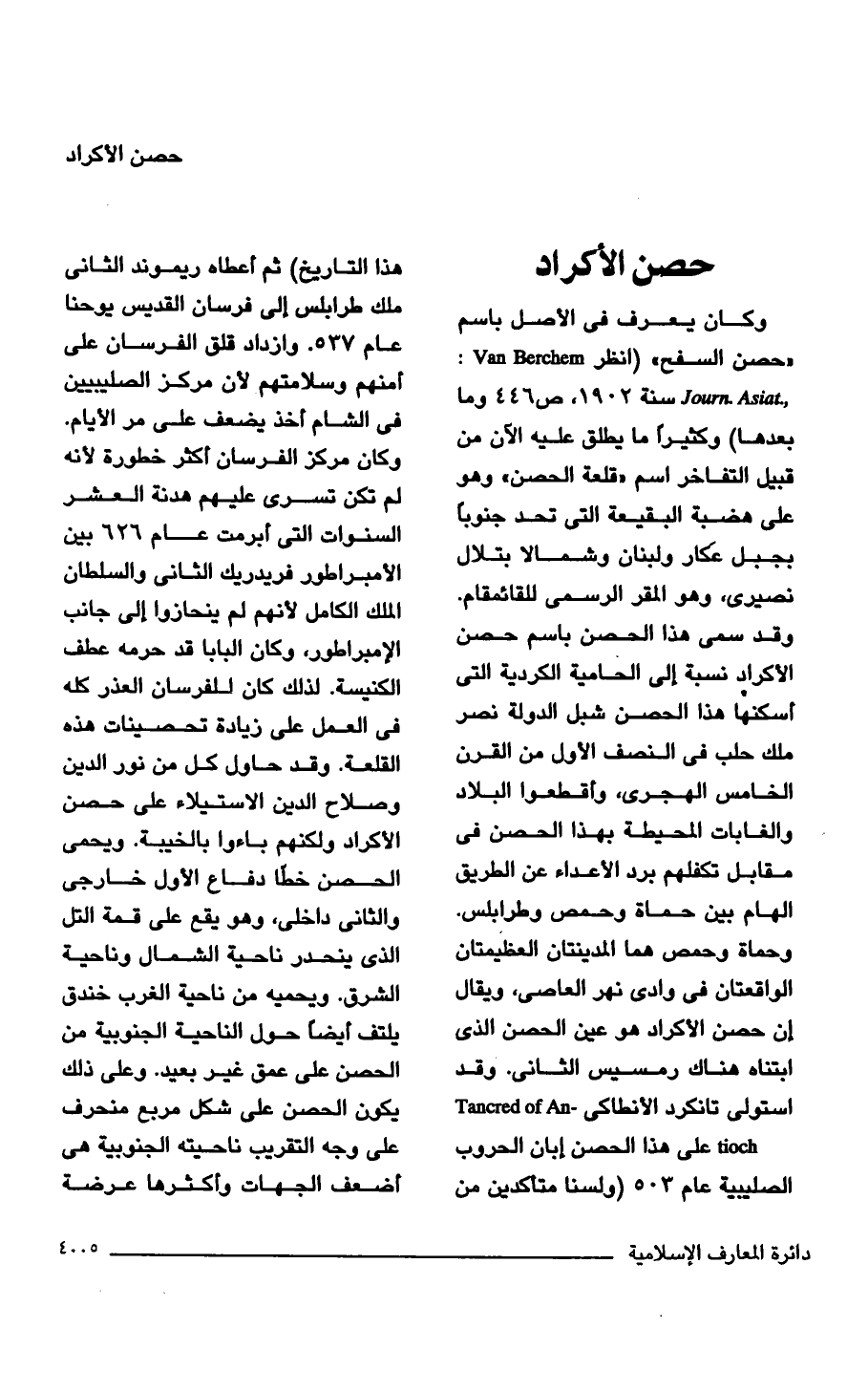 وكان يعرف في الأصل باسم "حصن السفح" (انظر Van Berchem: Journ Asiat, سنة 1902, ص 446 وما بعدها) وكثيرًا يطلق عليه الآن من قبيل التفاخر اسم "قلعة الحصن" وهو على هضبة البقيعة التي تحد جنوبًا بجبل عكار ولبنان وشمالًا بتلال نصيرى، وهو المقر الرسمى للقائمقام. وقد سمى هذا الحصن باسم حصن الأكراد نسبة إلى الحامية الكردية التي أسكنها هذا الحصن شبل الدولة نصر ملك حلب في النصف الأول من القرن الخامس الهجرى، وأقطعوا البلاد والغابات المحيطة بهذا الحصن في مقابل تكفلهم برد الأعداء عن الطريق الهام بين حماة وحمص وطرابلس. وحماة وحمص هما المدينتان العظيمتان الواقعتان في وادى نهر العاصى، ويقال أن حصن الأكراد هو عين الحصن الذي ابتناه هناك رمسيس الثانى. وقد استولى تانكرد الأنطاكى - Tancred of An tioch على هذا الحصن إبان الحروب الصليبية عام 503 هـ (ولسنا متأكدين من هذا التاريخ) ثم أعطاه ريموند الثانى ملك طرابلس إلى فرسان القديس يوحنا عام 537. وازداد قلق الفرسان على أمنهم وسلامتهم لأن مركز الصليبيين في الشام أخذ يضعف على مر الأيام. وكان مركز الفرسان أكثر خطورة لأنه لم تكن تسرى عليهم هدنة العشر السنوات التي أبرمت عام 626 بين الأمبراطور فريدريك الثانى والسلطان الملك الكامل لأنهم لم ينحازوا إلى جانب الإمبراطور، وكان البابا قد حرمه عطف الكنيسة. لذلك كان للفرسان العذر كله في العمل على زيادة تحصينات هذه القلعة. وقد حاول كل من نور الدين وصلاح الدين الاستيلاء على حصن الأكراد ولكنهم باءوا بالخيبة. ويحمى الحصن خطّا دفاع الأول خارجى والثانى داخلى، وهو يقع على قمة التل الذي ينحدر ناحية الشمال وناحية الشرق. ويحميه من ناحية الغرب خندق يلتف أيضًا حول الناحية الجنوبية من الحصن على عمق غير بعيد. وعلى ذلك يكون الحصن على شكل مربع منحرف على وجه التقريب ناحيته الجنوبية هي أضعف الجهات وأكثرها عرضة
