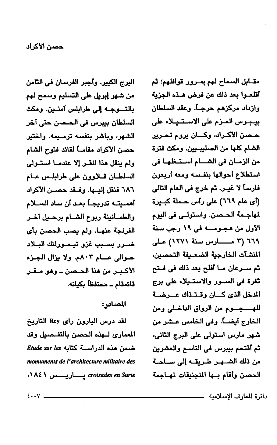 مقابل السماح لهم بمرور قوافلهم؛ ثم أقلعوا بعد ذلك عن فرض هذه الجزية وازداد مركزهم حرجًا. وعقد السلطان بيبرس العزم على الاستيلاء على حصن الأكراد، وكان يروم تحرير الشام كلها من الصليبيين. ومكث فترة من الزمان في الشام استغلها في استطلاع أحوالها بنفسه ومعه أربعون فارسًا لا غير. ثم خرج في العام التالى (أي عام 669) على رأس حملة كبيرة لمهاجمة الحصن. واستولى في اليوم الأول من هجومه في 19 رجب سنة 669 (3 مارس سنة 1271) على المنشآت الخارجية الضعيفة التحصين، ثم سرعان ما أفلح بعد ذلك في فتح ثغرة في السور والاستيلاء على برج المدخل الذي كان وقتذاك عرضة للهجوم من الرواق الداخلى ومن الخارج أيضًا. وفى الخامس عشر من شهر مارس استولى على البرج الثانى، ثم أقتحم بيبرس في التاسع والعشرين من ذلك الشهر طريقه إلى ساحة الحصن وأقام بها المنجنيقات لمهاجمة البرج الكبير. وأجبر الفرسان في الثامن من شهر إبريل على التسليم وسمح لهم بالتوجه إلى طرابلس آمنين. ومكث السلطان بيبرس في الحصن حتى آخر الشهر، وباشر بنفسه ترميمه. واختير حصن الأكراد مقامًا لقائد فتوح الشام ولم ينقل هذا المقر إلا عندما استولى السلطان قلاوون على طرابلس عام 686 فنقل اليها. وفقد حصن الأكراد أهميته تدريجًا بعد أن ساد السلام والطمأنينة ربوع الشام برحيل آخر الفرنجة عنها. ولم يصب الحصن بأى ضرر بسبب غزو تيمورلنك البلاد حوالى عام 803 م. ولا يزال الجزء الأكبر من هذا الحصن - وهو مقر قائمقام - محتفظًا بكيانه.
