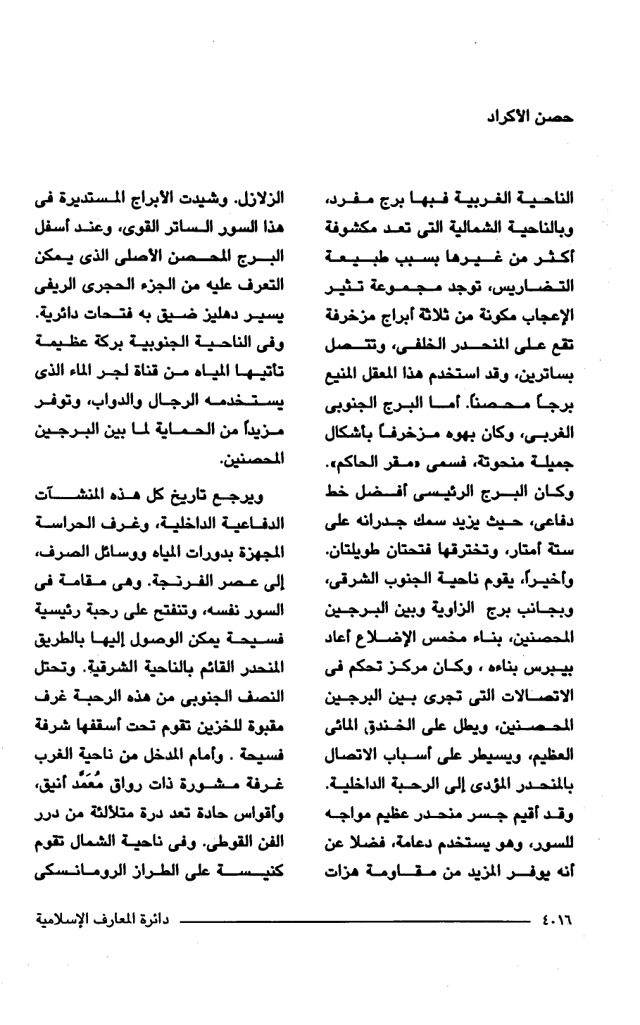 الناحية الغربية فيها برج مفرد, وبالناحية الشمالية التي تعد مكشوفة أكثر من غيرها بسبب طبيعة التضاريس، توجد مجموعة تثير الإعجاب مكونة من ثلاثة أبراج مزخرفة تقع على المنحدر الخلفى، وتتصل بساترين، وقد استخدم هذا المعقل المنيع برجًا محصنًا. أما البرج الجنوبى الغربى، وكان بهوه مزخرفًا بأشكال جميلة منحوتة، فسمى "مقر الحاكم". وكان البرج الرئيسى أفضل خط دفاعى، حيث يزيد سمك جدرانه على ستة أمتار، وتخترقها فتحتان طويلتان. وأخيرًا، يقوم ناحية الجنوب الشرقى، وبجانب برج الزاوية وبين البرجين المحصنين، بناء مخمس الأضلاع أعاد بيبرس بناءه , وكان مركز تحكم في الاتصالات التي تجرى بين البرجين المحصنين، ويطل على الخندق المائى العظيم، ويسيطر على أسباب الاتصال بالمنحدر المؤدى إلى الرحبة الداخلية. وقد أقيم جسر منحدر عظيم مواجه للسور، وهو يستخدم دعامة, فضلا عن أنه يوفر المزيد من مقاومة هزات الزلازل. وشيدت الأبراج المستديرة في هذا السور الساتر القوى، وعند أسفل البرج المحصن الأصلى الذي يمكن التعرف عليه من الجزء الحجرى الريفى يسير دهليز ضيق به فتحات دائرية. وفى الناحية الجنوبية بركة عظيمة تأتيها المياه من قناة لجر الماء الذي يستخدمه الرجال والدواب، وتوفر مزيدًا من الحماية لما بين البرجين المحصنين.