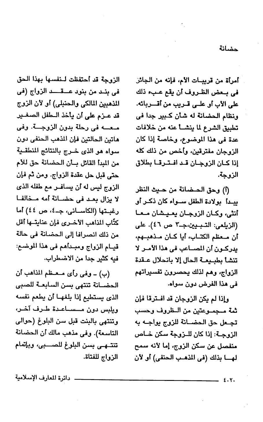 (أ) وحق الحضانة من حيث النظر يبدأ بولادة الطفل سواء كان ذكر أو أنثى، وكان الزوجان يعيشان معًا (الزيلعى: التبيين، جـ 3 ص 46). على أن معظم الكتاب، أيا كان مذهبهم، يدركون أن المصاعب في هذا الأمر لا تنشأ بطبيعة الحال إلا بانحلال عقدة الزواج، وهم لذلك يحصرون تفسيراتهم في هذا الفرض دون سواه.