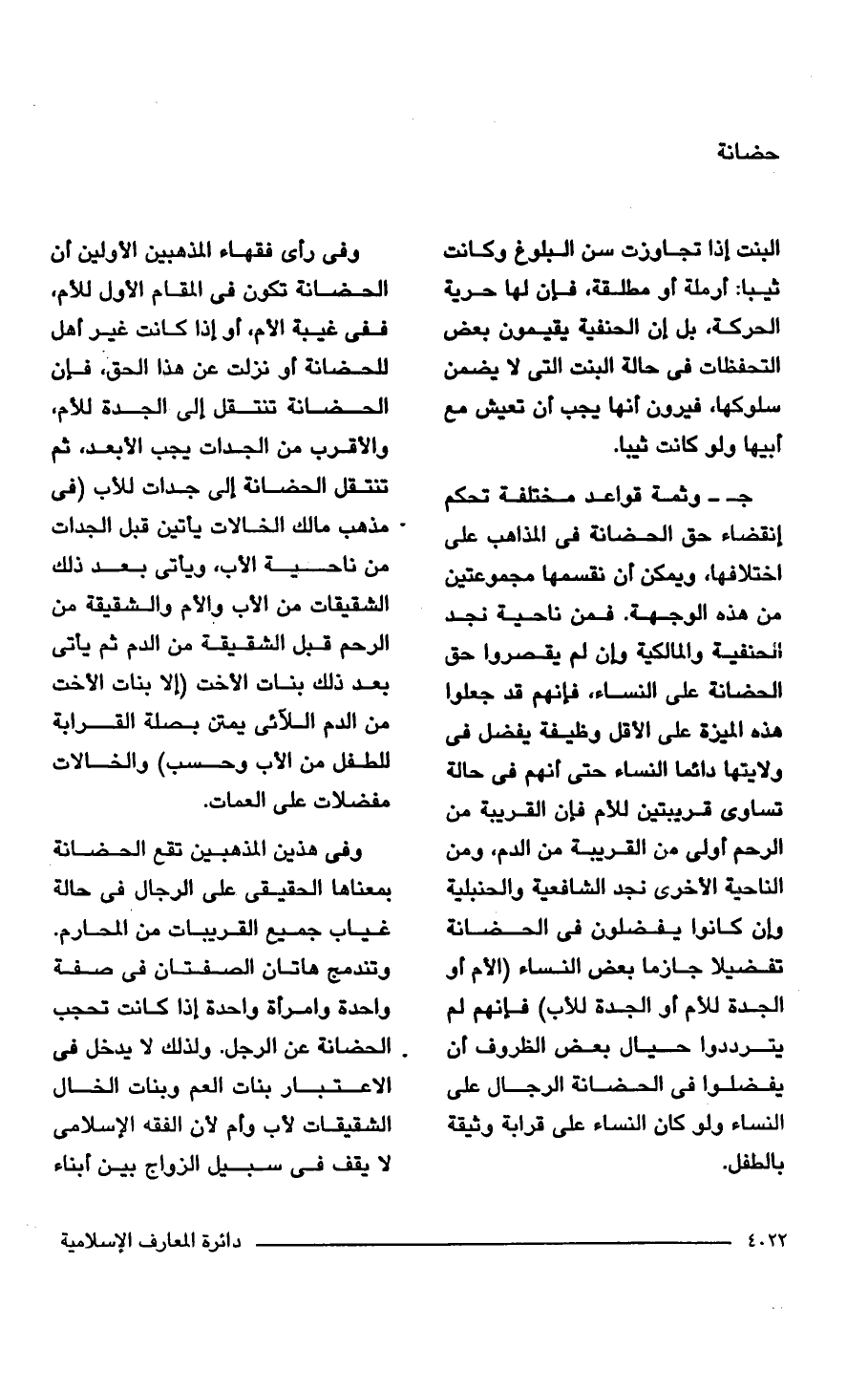 جـ - وثمة قواعد مختلفة تحكم إنقضاء حق الحضانة في المذاهب على اختلافها، ويمكن أن نقسمها مجموعتين من هذه الوجهة. فمن ناحية نجد الحنفية والمالكية وإن لم يقصروا حق الحضانة على النساء، فإنهم قد جعلوا هذه الميزة على الأقل وظيفة يفضل في ولايتها دائما النساء حتى أنهم في حالة تساوى قريبتين للأم فإن القريبة من الرحم أولى من القريبة من الدم، ومن الناحية الأخرى نجد الشافعية والحنبلية وإن كانوا يفضلون في الحضانة تفضيلا جازمًا بعض النساء (الأم أو الجدة للأم أو الجدة للأب) فإنهم لم يترددوا حيال بعض الظروف أن يفضلوا في الحضانة الرجال على النساء ولو كان النساء على قرابة وثيقة بالطفل.
