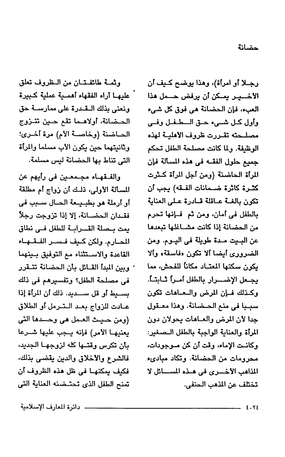رجلا أو امرأة)، وهذا يوضح كيف أن الأخير يمكن أن يرفض حمل هذا العبء، فإن الحضانة هي فوق كل شيء وأول كل شيء حق الطفل وفى مصلحته تقررت ظروف الأهلية لهذه الوظيفة. ولما كانت مصلحة الطفل تحكم جميع حلول الفقه في هذه المسألة فإن المرأة الحاضنة (ومن أجل المرأة كثرت كثرة كاثرة ضمانات الفقه) يجب أن تكون بالغة عاقلة قادرة على العناية بالطفل في أمان، ومن ثم فإنها تحرم من الحضانة إذا كانت مشاغلها تبعدها عن البيت مدة طويلة في اليوم. ومن الضروري أيضًا ألا تكون "فاسقة" وألا يكون سكنها المعتاد مكانًا للفحش، مما يجعل الإضرار بالطفل أمرًا ثابتًا. وكذلك فإن المرض والعاهات تكون سببًا في منع الحضانة. وهذا معقول جدا لأن المرض والعاهات يحولان دون المرأة والعناية الواجبة بالطفل الصغير: وكانت الإماء، وقت أن كن موجودات، محرومات من الحضانة. وتكاد مبادئ المذاهب الأخرى في هذه المسائل لا تختلف عن المذهب الحنفى.