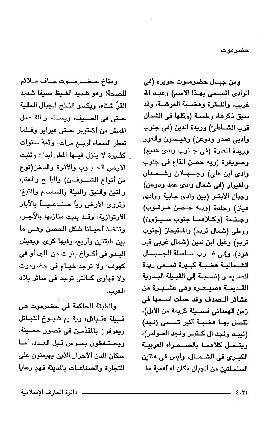 ومن جبال حضرموت حويره (في الوادى المسمى بهذا الاسم) وعبد الله غريب، والفقرة وهضبة العرشة، وقد سبق ذكرها، وطمحة (وكلها في الشمال قرب الشاطئ) وريدة الدين (في جنوب واديى عمدو ودوعن) وهيسون والغوز وريدة المعارة (في جنوب وادى عديم) وصويغرة (وبه حصن القاع في جنوب وادى ابن علي) وجهلان وغمدان والغيوار (في شمال وادي عمد ودوعن) وجبال الأبتر (بين وادى جابية ووادى هينن) وجلدة (وبه حصن عرقوب) وجثمة (وكلاهما جنوب سيؤون) ووطى (شمال تريم) والمنيحاز (جنوب تريم) وغيل ابن نمين (شمال غربى قبر هود). وإلى غرب سلسلة الجبال الشمالية هضبة كبيرة تسمى ريدة الصيعر إنسبة إلى القبيلة البدوية القديمة "صيعر" وهي عشيرة من عشائر الصدف وقد حملت اسمها في زمن الهمدانى فصيلة كريمة من الأبل)، تتصل بها هضبة أكبر تسمى (نجد) (نييد ونجد آل كثير ونجد العوامر)، ويتصل كلاهما بالصحراء العربية الكبرى في الشمال، وليس في هاتين السلسلتين من الجبال مكان له أهمية ما.