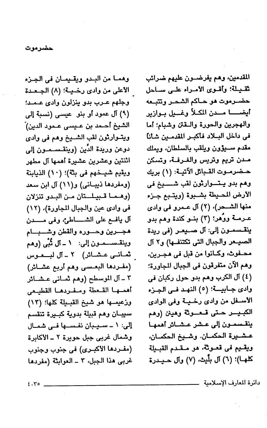 المقدمين، وهم يفرضون عليهم ضرائب ثقيلة؛ وأقوى الأمراء على ساحل حضرموت هو حاكم الشحر وتتبعه أيضًا مدن المكلا وغيل بوازير والهجرين والحورة والقتن وشبام؛ أما في داخل البلاد فأكبر المقدمين شأنًا مقدم سيؤون ويلقب بالسلطان، ويملك مدن تريم وتريس والغرفة، وتسكن حضرموت القبائل الآتية: (1) بريك وهم بدو يتوارثون لقب شيخ في الأرض المحيطة بشبوة (ويتبع جزء منها الشحر)، (2) آل عمرو في وادى عرمة ووُهر؛ (3) بنو كندة وهم بدو ينقسمون إلى: آل صيعر (في ريدة الصيعر والجبال التي تكتنفها) و 2 آل محفوث، وكانوا من قبل في هجرين، وهم الآن متفرقون في الجبال المجاورة؛ (4) آل الكرب وهم بدو حول ركبان في وادى جابية؛ (5) النهد في الجزء الأسفل من وادى رخية وفى الوادى الكبير حتى قعوثة وهينن (وهم ينقسمون إلى عشر عشائر أهمها عشيرة الحكمان. وشيخ الحكمان، ويقيم في قعوثة، هو مقدم القبيلة كلها)؛ (6) آل بلَّيث، (7) وآل حيدرة وهما من البدو ويقيمان في الجزء الأعلى من وادى رخية؛ (8) الجعدة وجلهم عرب بدو ينزلون وادى عمد؛ (9) آل عمود أو بنو عيسى (نسبة إلى الشيخ أحمد بن عيسى عمود الدين) ويتوارثون لقب الشيخ وهم في وادى دوعن وريدة الدَّين (وينقسمون إلى اثنتين وعشرين عشيرة أهمها آل مطهر ويقيم شيخهم في بثة)؛ (10) الذيابنة (ومفردها ذيبانى) و (11) آل ابن سعد (وهما قبيلتان من البدو تنزلان في وادى عين والجبال المجاورة)، (12) آل يافع على الشاطئ، وفى مدن هجرين وحوره والقطن وشبام وينقسمون إلى: