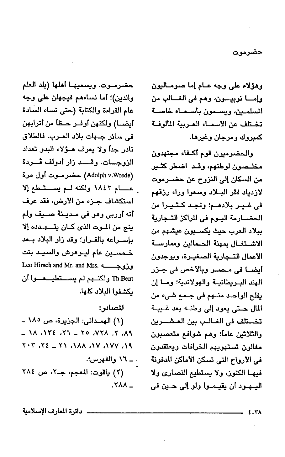 والحضرميون قوم أكفاء مجتهدون مخلصون لوطنهم، وقد اضطر كثير من السكان إلى النزوح عن حضرموت لازدياد فقر البلاد وسعوا وراء رزقهم في غير بلادهم؛ ونجد كثيرًا من الحضارمة اليوم في المراكز التجارية ببلاد العرب حيث يكسبون عيشهم من الاشتغال بمهنة الحمالين وممارسة الأعمال التجارية الصغيرة، ويوجدون أيضًا في مصر وبالأخص في جزر الهند البريطانية والهولاندية؛ وما إن يفلح الواحد منهم في جمع شيء من المال حتى يعود إلى وطنه بعد غيبة تختلف في الغالب بين العشرين والثلاثين عامًا؛ وهم شوافع متعصبون مغالون تستهويهم الخرافات ويعتقدون في الأرواح التي تسكن الأماكن المدفونة فيها الكنوز، ولا يستطيع النصارى ولا اليهود أن يقيموا ولو إلى حين في حضرموت. ويسميها أهلها (بلد العلم والدين)؛ أما نساءهم فيجهلن على وجه عام القراءة والكتابة (حتى نساء السادة أيضًا) ولكنهن أوفر حظًا من أترابهن في سائر جهات بلاد العرب. فالطلاق نادر جدًا ولا يعرف هؤلاء البدو تعداد الزوجات. وقد زار أدولف فردة (Adolph v.Wrede) حضرموت أول مرة عام 1843 ولكنه لم يستطع إلا استكشاف جزء من الأرض، فقد عرف أنه أوربى وهو في مدينة صيف ولم ينج من الموت الذي كان يتهدده إلا بإسراعه بالفرار؛ وقد زار البلاد بعد خمسين عام ليوهرش والسيد بنت وزوجه. Leo Hirsch and Mr. and Mrs Th.Bent ولكنهم لم يستطيعوا أن يكشفوا البلاد كلها.