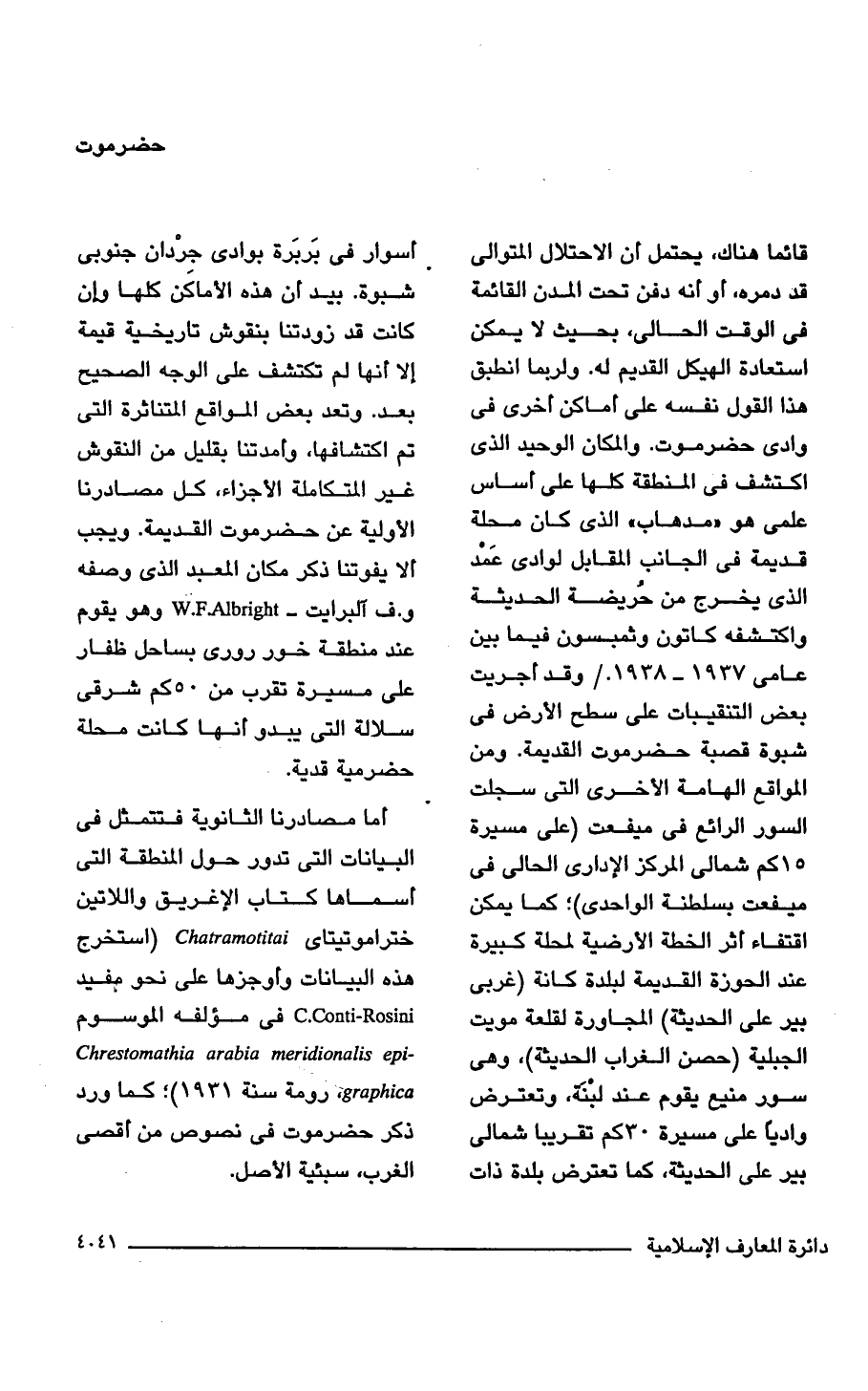 قائمًا هناك، يحتمل أن الاحتلال المتوالى قد دمره، أو أنه دفن تحت المدن القائمة في الوقت الحالى، بحيث لا يمكن استعادة الهيكل القديم له. ولربما انطبق هذا القول نفسه على أماكن أخرى في وادى حضرموت. والمكان الوحيد الذي اكتشف في المنطقة كلها على أساس علمي هو "مدهاب" الذي كان محلة قديمة في الجانب المقابل لوادى عَمْد الذي يخرج من حُريضة الحديثة واكتشفه كاتون وثمبسون فيما بين عامى 1937 - 1938./ وقد أجريت بعض التنقيبات على سطح الأرض في شبوة قصبة حضرموت القديمة. ومن المواقع الهامة الأخرى التي سجلت السور الرائع في ميفعت (على مسيرة 15 كم شمالى المركز الإدارى الحالى في ميفعت بسلطنة الواحدى)؛ كما يمكن اقتفاء أثر الخطبة الأرضية لمحلة كبيرة عند الحوزة القديمة لبلدة كانة (غربى بير على الحديثة) المجاورة لقلعة مويت الجبلية (حصن الغراب الحديثة)، وهي سور منيع يقوم عند لبْنَة، وتعترض واديًا على مسيرة 30 كم تقريبًا شمالى بير على الحديثة، كما تعترض بلدة ذات أسوار في بَربَرة بوادى جِرْدان جنوبى شبوة. بيد أن هذه الأماكن كلها وإن كانت قد زودتنا بنقوش تاريخية قيمة إلا أنها لم تكتشف على الوجه الصحيح بعد. وتعد بعض المواقع المتناثرة التي تم اكتشافها، وأمدتنا بقليل من النقوش غير المتكاملة الأجزاء، كل مصادرنا الأولية عن حضرموت القديمة. ويجب ألا يفوتنا ذكر مكان المعبد الذي وصفه و. ف آلبرايت - W.F.Albright وهو يقوم عند منطقة خور رورى بساحل ظفار على مسيرة تقرب من 50 كم شرقى سلالة التي يبدو أنها كانت محلة حضرمية قديمة.