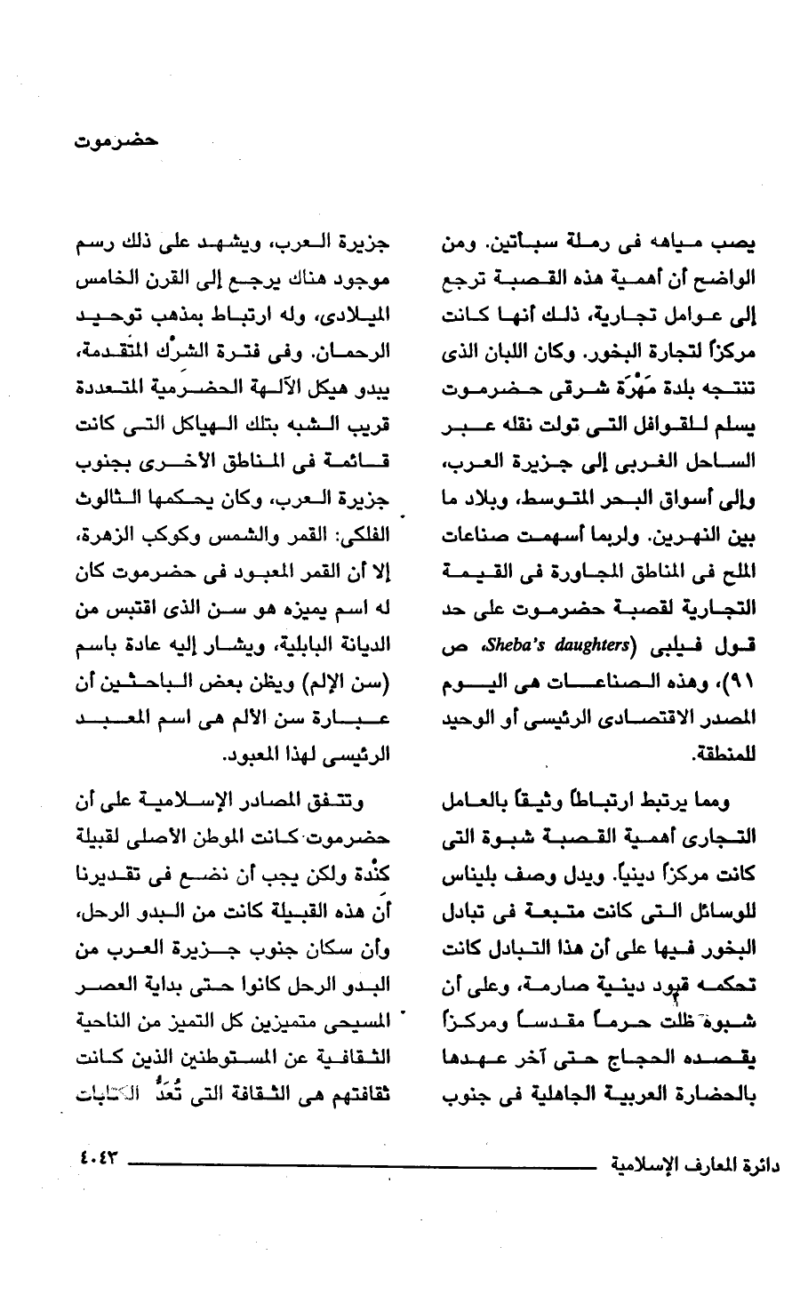 يصب مياهه في رملة سبأتين. ومن الواضح أن أهمية هذه القصبة ترجع إلى عوامل تجارية، ذلك أنها كانت مركزًا لتجارة البخور. وكان اللبان الذي تنتجه بلدة مَهْرَة شرقى حضرموت يسلم للقوافل التي تولت نقله عبر الساحل الغربى إلى جزيرة العرب، وإلى أسواق البحر المتوسط، وبلاد ما بين النهرين. ولربما أسهمت صناعات الملح في المناطق المجاورة في القيمة التجارية لقصبة حضرموت على حد قول فيلبى (Sheba's daughters، ص 91)، وهذه الصناعات هي اليوم المصدر الاقتصادى الرئيسى أو الوحيد للمنطقة.