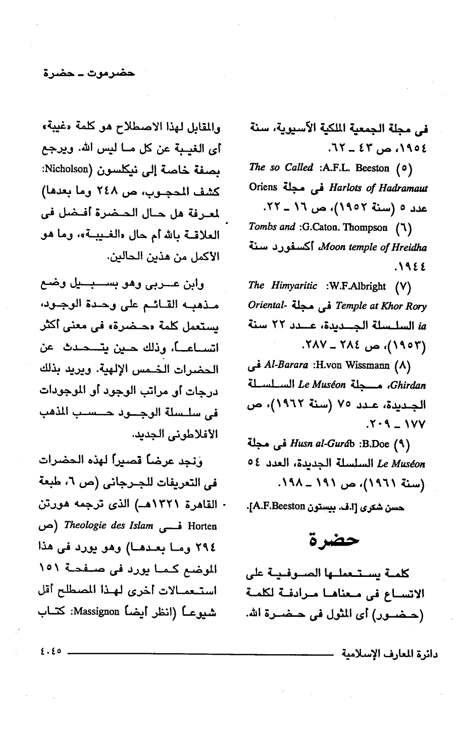 ونجد عرضًا قصيرًا لهذه الحضرات في التعريفات للجرجانى (ص 6، طبعة القاهرة 1321 هـ) الذي ترجمه هورتن Horten في Theologie des Islam، (ص 294 وما بعدها) وهو يورد في هذا الموضع كما يورد في صفحة 151 استعمالات أخرى لهذا المصطلح أقل شيوعًا (انظر أيضًا Massignon: كتاب