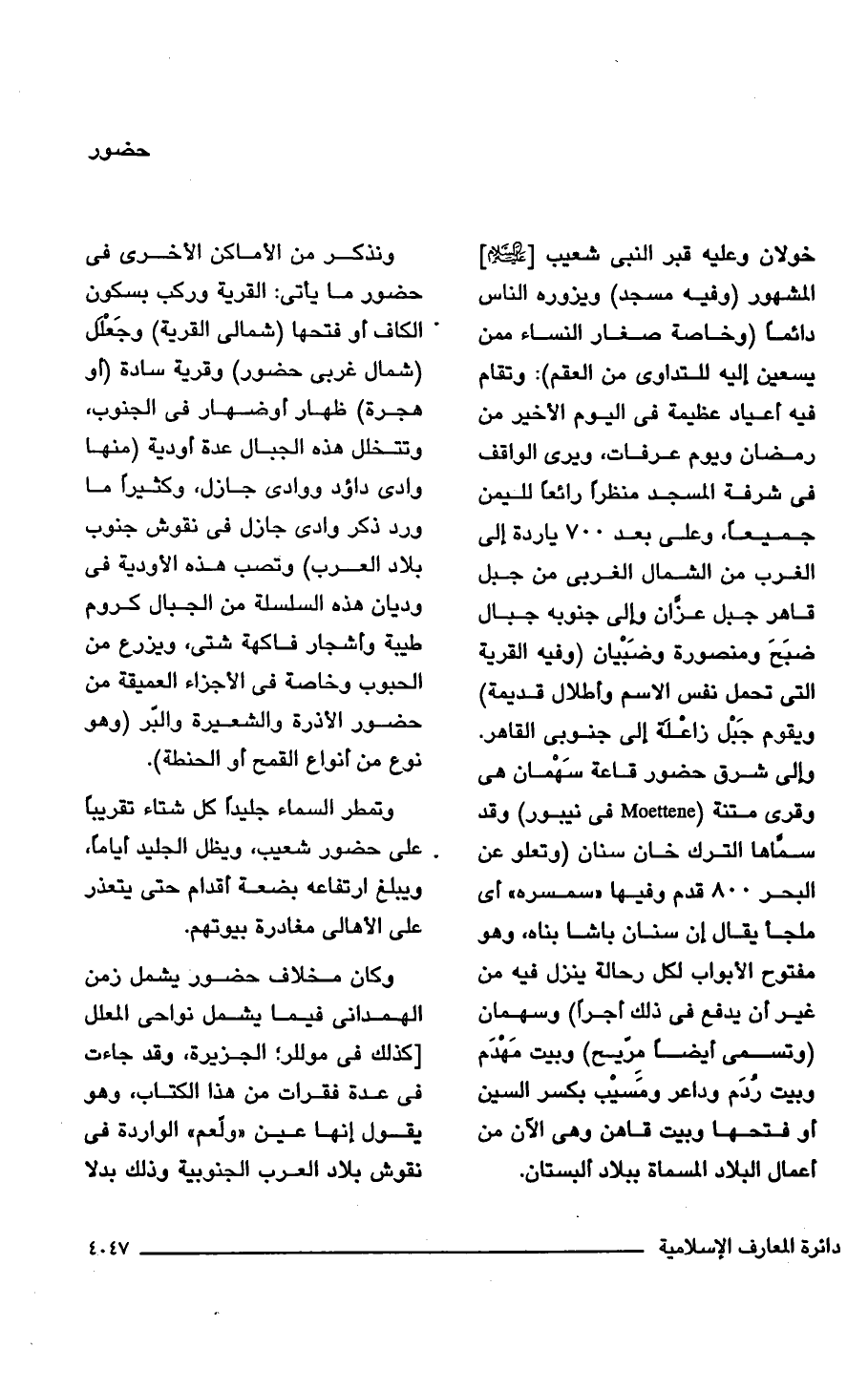 خولان وعليه قبر النبي شعيب [- عليه السلام -] المشهور (وفيه مسجد) ويزوره الناس دائمًا (وخاصة صغار النساء ممن يسعين إليه للتداوى من العقم): وتقام فيه أعياد عظيمة في اليوم الأخير من رمضان ويوم عرفات، ويرى الواقف في شرفة المسجد منظرًا رائعًا لليمن جميعًا، وعلى بعد 700 ياردة إلى الغرب من الشمال الغربى من جبل قاهر جبل عزان وإلى جنوبه جبال ضبَحَ ومنصورة وضَبْيان (وفيه القرية التي تحمل نفس الاسم وأطلال قديمة) ويقوم جَبْل زاعْلَة إلى جنوبى القاهر. وإلى شرق حضور قاعة سَهْمان هي وقرى متنة (Moettene في نيبور) وقد سمَّاها الترك خان سنان (وتعلو عن البحر 800 قدم وفيها "سمسره" أى ملجأ يقال إن سنان باشا بناه، وهو مفتوح الأبواب لكل رحالة ينزل فيه من غير أن يدفع في ذلك أجرًا) وسهمان (وتسمى أيضًا مِرَيح) وبيت مَهْدَم وبيت رُدَم وداعر ومَسيْب بكسر السين أو فتحها وبيت قاهن وهي الآن من أعمال البلاد المسماة ببلاد ألبستان.