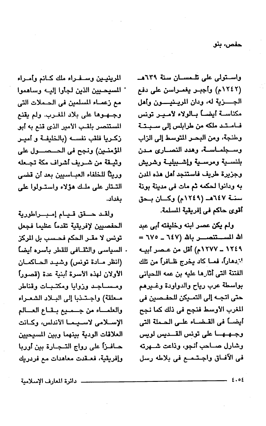 ولقد حقق قيام إمبراطورية الحفصيين لإفريقية تقدمًا عظيما فجعل تونس لا مقر الحكم فحسب بل المركز السياسى والثقافى للقطر بأسره أيضًا (انظر مادة تونس) وشيد الحاكمان الأولان لهذه الأسرة أبنية عدة (قصورًا ومساجد وزوايا ومكتبات وقناطر معلقة) واجتذبا إلى البلاد الشعراء والعلماء من جميع بقاع العالم الإسلامى لا سيما الأندلس، وكانت العلاقات الودية بينهما وبين المسيحيين حافزًا على رواج التجارة بين أوربا وإفريقية، فعقدت معاهدات مع فردريك
