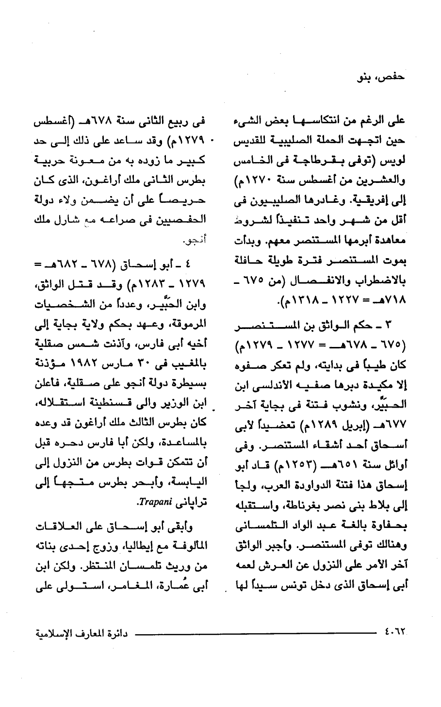 3 - حكم الواثق بن المستنصر (675 - 678 هـ = 1277 - 1279 م) كان طيبًا في بدايته، ولم تعكر صفوه إلا مكيدة دبرها صفيه الأندلسى ابن الحبَيَّر، ونشوب فتنة في بجاية آخر 677 هـ (إبريل 1289 م) تعضيدًا لأبي إسحاق أحد أشقاء المستنصر. وفى أوائل سنة 651 هـ (1253 م) قاد أبو إسحاق هذا فتنة الدواودة العرب، ولجأ إلى بلاط بنى نصر بغرناطة، واستقبله بحفاوة بالغة عبد الواد التلمسانى وهنالك توفى المستنصر. وأجبر الواثق آخر الأمر على النزول عن العرش لعمه أبى إسحاق الذي دخل تونس سيدًا لها في ربيع الثانى سنة 678 هـ (أغسطس 1279 م) وقد ساعد على ذلك إلى حد كبير ما زوده به من معونة حربية بطرس الثانى ملك أراغون، الذي كان حريصًا على أن يضمن ولاء دولة الحفصيين في صراعه مع شارل ملك أنجو.