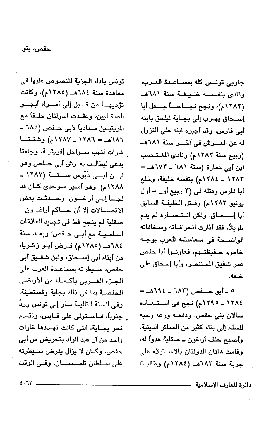 5 - أبو حفص (683 - 694 هـ = 1284 - 1295 م) نجح في استعادة سالان بنى حفص. ودفعه ورعه وحبه للسلم إلى بناء كثير من العمائر الدينية. وأصبح حلف آراغون - صقلية عدوًا له، وقامت هاتان الدولتان بالاستيلاء على جربة سنة 683 هـ (1284 م) وطالبتا تونس بأداء الجزية المنصوص عليها في معاهدة سنة 684 هـ (1285 م)، وكانت تؤديها من قبل إلى أمراء أبجو الصقليين، وعقدت الدولتان حلفًا مع المرينيين معاديًا لأبي حفص (685 - 686 هـ = 1286 - 1287 م). وشنتا غارات لنهب سواحل إفريقية، وجاءتا بدعى ليطالب بعرش أبي حفص وهو ابن ابى دَبّوس سنة (1287 - 1288 م)، وهو أمير موحدى كان قد لجأ إلى أراغون. وحدثت بعض الاتصالات إلا أن حاكم أراغون - صقلية لم ينجح قط في تجديد العلاقات السلمية مع أبي حفص؛ وبعد سنة 684 هـ (1285 م) فرض أبو زكريا، من أبناء ابى إسحاق، وابن شقيق أبى حفص، سيطرته بمساعدة العرب على الجزء الغربى بأكمله من الأراضى الحفصية بما في ذلك بجاية وقسنطينة. وفى السنة التالية سار إلى تونس وردّ جنوبًا، فاستولى على قابس، وتقدم نحو بجاية، التي كانت تهددها غارات واحد من آل عبد الواد بتحريض من أبى حفص، وكان لا يزال يفرض سيطرته على سلطان تلمسان. وفى الوقت
