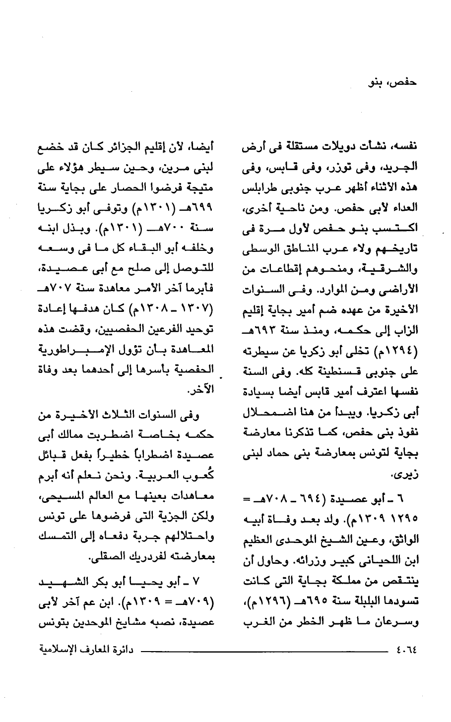 6 - أبو عصيدة (694 - 708 هـ = 1295 - 1309 م). ولد بعد وفاة أبيه الواثق، وعين الشيخ الموحدى العظيم ابن اللحيانى كبير وزرائه. وحاول أن ينتقص من مملكة بجاية التي كانت تسودها البلبلة سنة 695 هـ (1296 م)، وسرعان ما ظهر الخطر من الغرب أيضًا، لأن إقليم الجزائر كان قد خضع لبنى مرين، وحين سيطر هؤلاء على متيجة فرضوا الحصار على بجاية سنة 699 هـ (1301 م) وتوفى أبو زكريا سنة 700 هـ (1301 م). وبذل ابنه وخلفه أبو البقاء كل ما في وسعه للتوصل إلى صلح مع أبي عصيدة، فأبرما آخر الأمر معاهدة سنة 707 هـ (1307 - 1308 م) كان هدفها إعادة توحيد الفرعين الحفصيين، وقضت هذه المعاهدة بأن تؤول الإمبراطورية الحفصية بأسرها إلى أحدهما بعد وفاة الآخر.