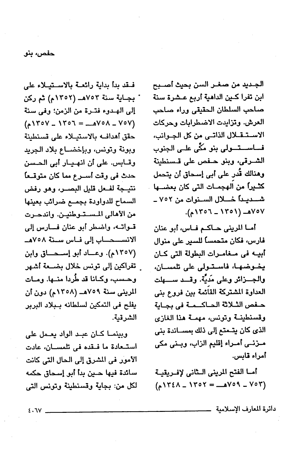 أما المرينى حاكم فاس، أبو عنان فارس، فكان متحمسًا للسير على منوال أبيه في مغامرات البطولة التي كان يخوضها، فاستولى على تلمسان، والجزائر وعلى مَدِيَّة. وقد سهلت العداوة المشتركة القائمة بين فروع بنى حفص الثلاثة الحاكمة في بجاية وقسنطينة وتونس، مهمة هذا الغازى الذي كان يتمتع إلى ذلك بمساندة بنى مزنى أمراء إقليم الزاب، وبنى مكى أمراء قابس.