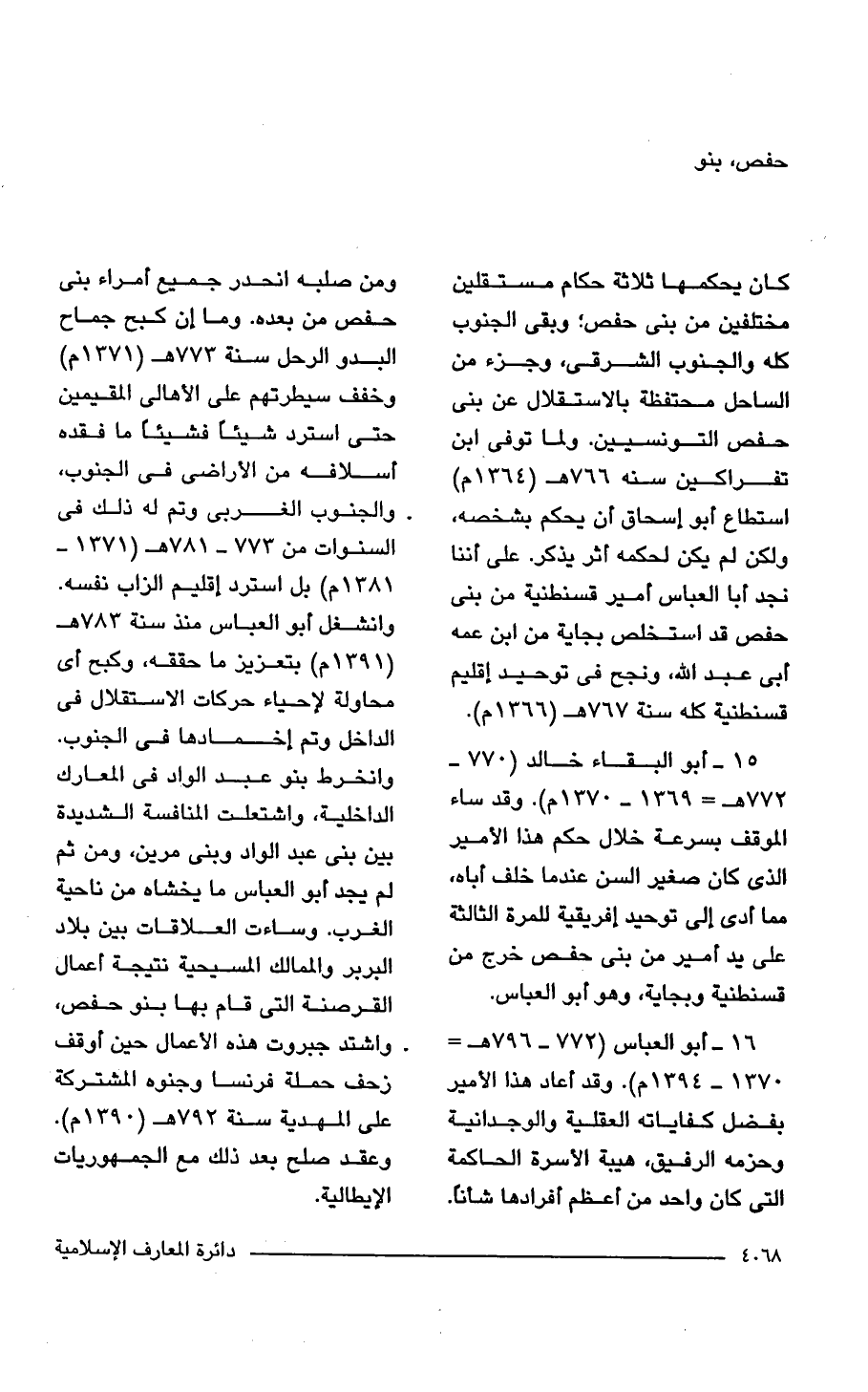 16 - أبو العباس (772 - 796 هـ = 1370 - 1394 م). وقد أعاد هذا الأمير بفضل كفاياته العقلية والوجدانية وحزمه الرفيق، هيبة الأسرة الحاكمة التي كان واحد من أعظم أفرادها شأنًا. ومن صلبه انحدر جميع أمراء بنى حفص من بعده. وما إن كبح جماح البدو الرحل سنة 773 هـ (1371 م) وخفف سيطرتهم على الأهالى المقيمين حتى استرد شيئًا فشيئًا ما فقده أسلافه من الأراضى في الجنوب، والجنوب الغربى وتم له ذلك في السنوات من 773 - 781 هـ (1371 - 1381 م) بل استرد إقليم الزاب نفسه. وانشغل أبو العباس منذ سنة 783 هـ - (1391 م) بتعزيز ما حققه، وكبح أي محاولة لإحياء حركات الاستقلال في الداخل وتم إخمادها في الجنوب. وانخرط بنو عبد الواد في المعارك الداخلية، واشتعلت المنافسة الشديدة بين بنى عبد الواد وبنى مرين، ومن ثم لم يجد أبو العباس ما يخشاه من ناحية الغرب. وساءت العلاقات بين بلاد البربر والممالك المسيحية نتيجة أعمال القرصنة التي قام بها بنو حفص، واشتد جبروت هذه الأعمال حين أوقف زحف حملة فرنسا وجنوه المشتركة على المهدية سنة 792 هـ (1390 م). وعقد صلح بعد ذلك مع الجمهوريات الإيطالية.