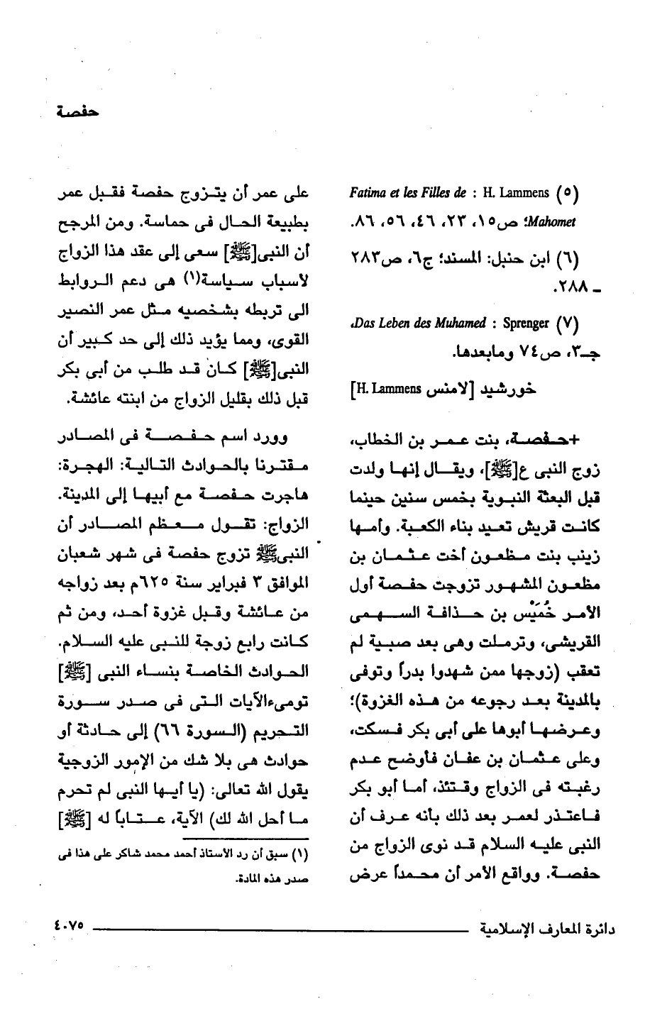 + حفصة, بنت عمر بن الخطاب، زوج النبي ع [- صلى الله عليه وسلم -] , ويقال إنها ولدت قبل البعثة النبوية بخمس سنين حينما كانت قريش تعيد بناء الكعبة. وأمها زينب بنت مظعون أخت عثمان بن مظعون المشهور تزوجت حفصة أول الأمر خُمَيْس بن حذافة السهمى القريشى، وترملت وهي بعد صبية لم تعقب (زوجها ممن شهدوا بدرًا وتوفى بالمدينة بعد رجوعه من هذه الغزوة)؛ وعرضها أبوها على أبي بكر فسكت، وعلى عثمان بن عفان فأوضح عدم رغبته في الزواج وقتئذ، أما أبو بكر فاعتذر لعمر بعد ذلك بأنه عرف أن النبي عليه السلام قد نوى الزواج من حفصة. وواقع الأمر أن محمدًا عرض على عمر أن يتزوج حفصة فقبل عمر بطبيعة الحال في حماسة. ومن المرجح أن النبي [- صلى الله عليه وسلم -] سعى إلى عقد هذا الزواج لأسباب سياسة (¬1) وهى دعم الروابط التى تربطه بشخصيه مثل عمر النصير القوى، ومما يؤيد ذلك إلى حد كبير أن النبي [- صلى الله عليه وسلم -] كان قد طلب من أبي بكر قبل ذلك بقليل الزواج من ابنته عائشة.
