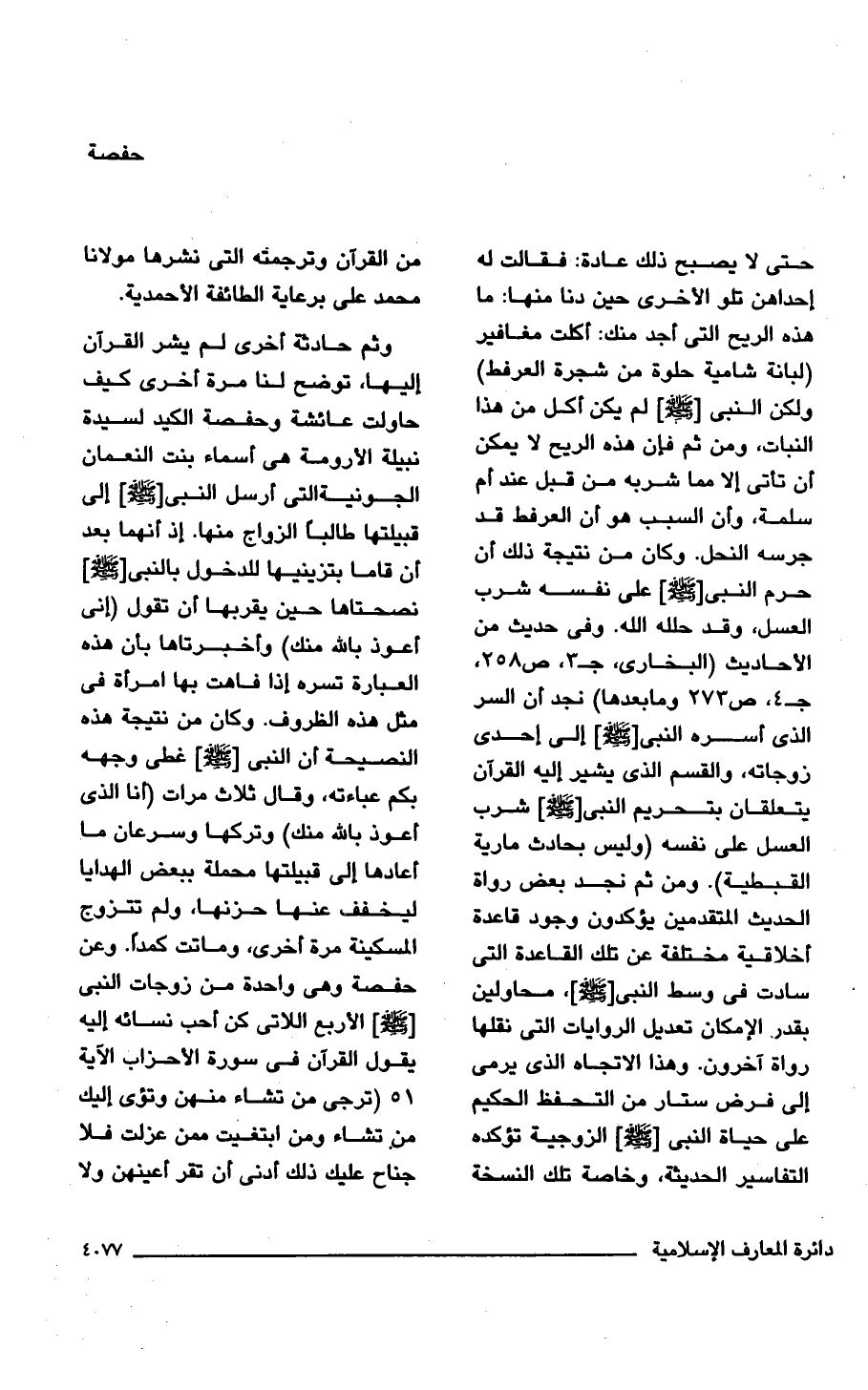 حتى لا يصبح ذلك عادة: فقالت له إحداهن تلو الأخرى حين دنا منها: ما هذه الريح التي أجد منك: أكلت مغافير (لبانة شامية حلوة من شجرة العرفط) ولكن النبي [- صلى الله عليه وسلم -] لم يكن أكل من هذا النبات، ومن ثم فإن هذه الريح لا يمكن أن تأتى إلا مما شربه من قبل عند أم سلمة، وأن السبب هو أن العرفط قد جرسه النحل. وكان من نتيجة ذلك أن حرم النبي [- صلى الله عليه وسلم -] على نفسه شرب العسل، وقد حلله الله. وفى حديث من الأحاديث (البخاري، جـ 3، ص 258، جـ 4، ص 273 وما بعدها) نجد أن السر الذي أسره النبي [- صلى الله عليه وسلم -] إلى إحدى زوجاته، والقسم الذي يشير إليه القرآن يتعلقان بتحريم النبي [- صلى الله عليه وسلم -] شرب العسل على نفسه (وليس بحادث مارية القبطية). ومن ثم نجد بعض رواة الحديث المتقدمين يؤكدون وجود قاعدة أخلاقية مختلفة عن تلك القاعدة التي سادت في وسط النبي [- صلى الله عليه وسلم -]، محاولين بقدر الإمكان تعديل الروايات التي نقلها رواة آخرون. وهذا الاتجاه الذي يرمى إلى فرض ستار من التحفظ الحكيم على حياة النبي [- صلى الله عليه وسلم -] الزوجية تؤكده التفاسير الحديثة، وخاصة تلك النسخة من القرآن وترجمته التي نشرها مولانا محمد على برعاية الطائفة الأحمدية.