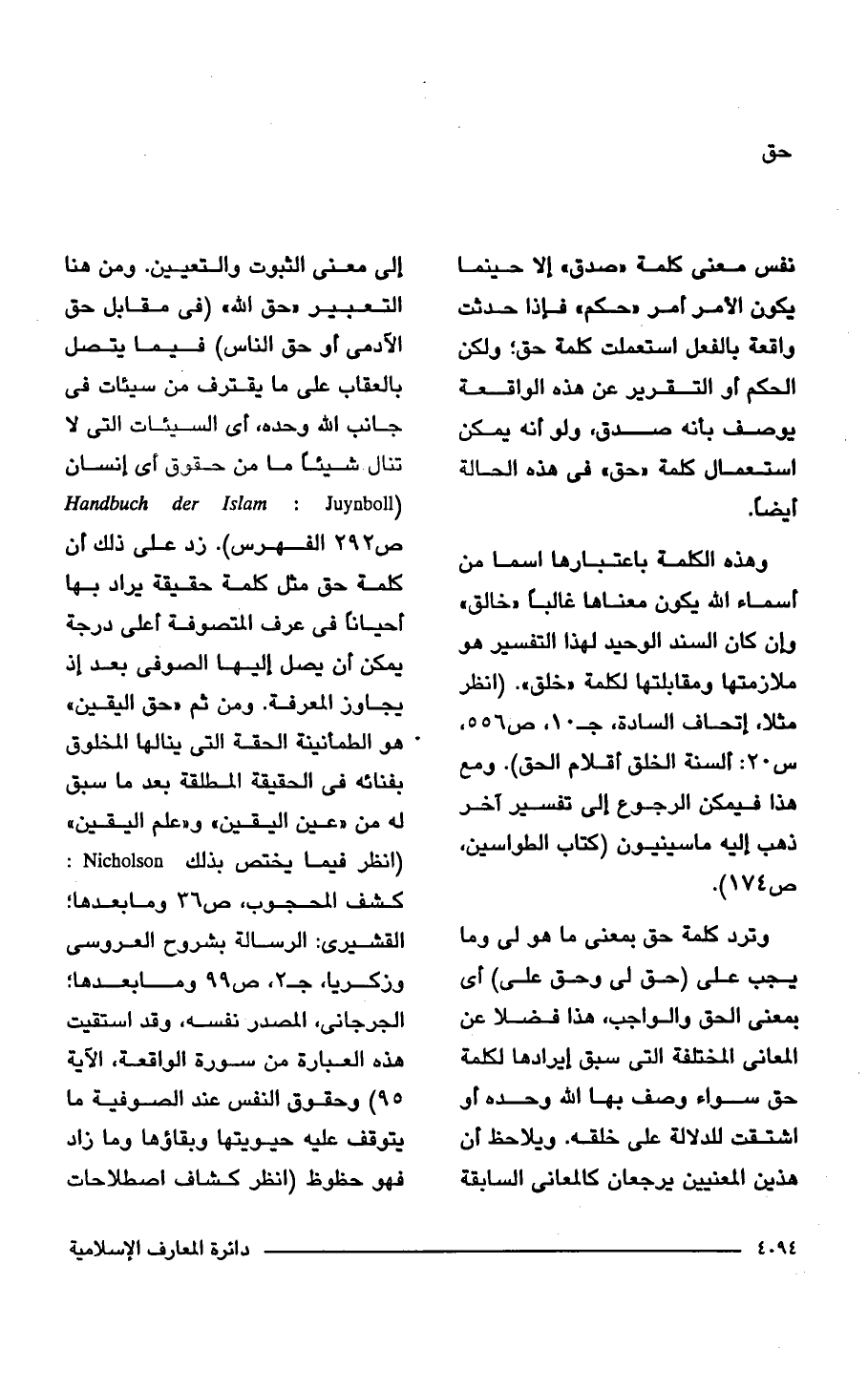 وترد كلمة حق بمعنى ما هو لى وما يجب على (حق لى وحق على) أى بمعنى الحق والواجب، هذا فضلا عن المعانى المختلفة التى سبق إيرادها لكلمة حق سواء وصف بها الله وحده أو اشتقت للدلالة على خلقه. ويلاحظ أن هذين المعنيين يرجعان كالمعانى السابقة إلى معنى الثبوت والتعيين. ومن هنا التعبير "حق الله" (فى مقابل حق الآدمى أو حق الناس) فيما يتصل بالعقاب على ما يقترف من سيئات فى جانب الله وحده، أى السيئات التى لا تنال شيئًا ما من حقوق أى إنسان (Handbuch der Islam: Juynboll ص 292 الفهرس). زد على ذلك أن كلمة حق مثل كلمة حقيقة يراد بها أحيانًا فى عرف المتصوفة أعلى درجة يمكن أن يصل اليها الصوفى بعد إذ يجاوز المعرفة. ومن ثم "حق اليقين" هو الطمأنينة الحقة التى ينالها المخلوق بفنائه فى الحقيقة المطلقة بعد ما سبق له من "عين اليقين" و"علم اليقين" (انظر فيما يختص بذلك Nicholson: كشف المحجوب، ص 36 وما بعدها؛ القشيرى: الرسالة بشروح العروسى وزكريا، جـ 2، ص 99 وما بعدها؛ الجرجانى، المصدر نفسه، وقد استقيت هذه العبارة من سورة الواقعة، الآية 95) وحقوق النفس عند الصوفية ما يتوقف عليه حيويتها وبقاؤها وما زاد فهو حظوظ (انظر كشاف اصطلاحات