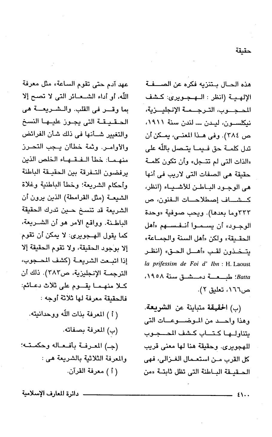 (ب) الحقيقة متباينة عن الشريعة. وهذا واحد من الموضوعات التى يتناولها كتاب كشف المحجوب للهجويرى. وحقيقة هنا لها معنى قريب كل القرب من استعمال الغزالى، فهى الحقيقة الباطنة التى تظل ثابتة "من عهد آدم حتى تقوم الساعة" مثل معرفة الله، أو أداء الشعائر التى لا تصح إلا بما وقر فى القلب. والشريعة هى الحقيقة التى يجوز عليها النسخ والتغيير شأنها فى ذلك شأن الفرائض والأوامر. وثمة خطأان يجب التحرز منهما: خطأ الفقهاء الخلص الذين يرفضون التفرقة بين الحقيقة الباطنة وأحكام الشريعة؛ وخطأ الباطنية وغلاة الشيعة (مثل القرامطة) الذين يرون أن الشريعة قد تنسخ حين تدرك الحقيقة الباطنة. وواقع الأمر هو أن الشريعة، كما يقول الهجويرى: لا يمكن أن تقوم إلا بوجود الحقيقة، ولا تقوم الحقيقة إلا إذا اتبعت الشريعة (كشف المحجوب، الترجمة الإنجليزية، ص 383). ذلك أن كلا منهما يقوم على ثلاث دعائم: فالحقيقة معرفة لها ثلاثة أوجه: