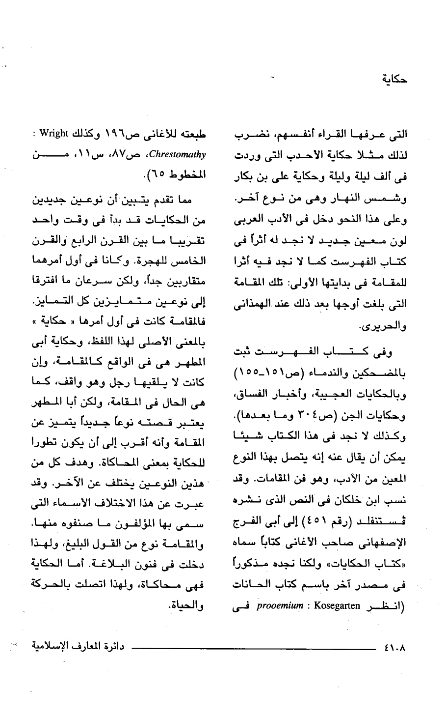 وفى كتاب الفهرست ثبت بالمضحكين والندماء (ص 151 - 155) وبالحكايات العجيبة، وأخبار الفساق، وحكايات الجن (ص 304 وما بعدها). وكذلك لا نجد فى هذا الكتاب شيئا يمكن أن يقال عنه إنه يتصل بهذا النوع المعين من الأدب، وهو فن المقامات. وقد نسب ابن خلكان فى النص الذى نشره فستنفلد (رقم 451) إلى أبى الفرج الإصفهانى صاحب الأغانى كتابًا سماه "كتاب الحكايات" ولكنا نجده مذكورًا فى مصدر آخر باسم كتاب الحانات (انظر prooemium: Kosegarten فى طبعته للأغانى ص 196 وكذلك Wright: Chrestomathy، ص 87, س 11 , من المخطوط 65).