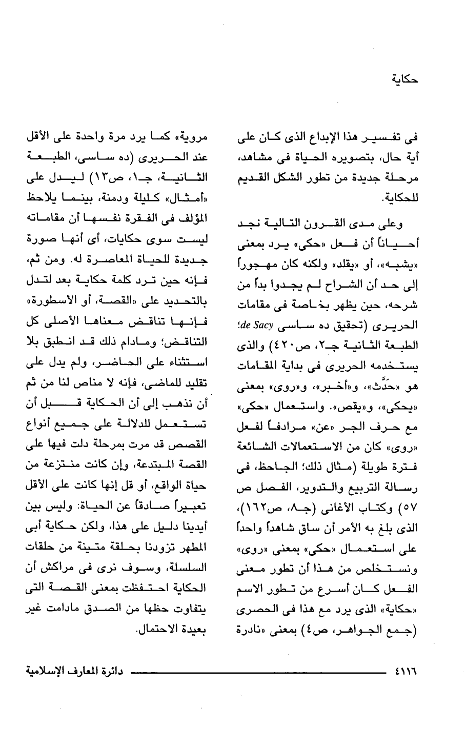 وعلى مدى القرون التالية نجد أحيانًا أن فعل "حكى" يرد بمعنى "يشبه"، أو "يقلد" ولكنه كان مهجورًا إلى حد أن الشراح لم يجدوا بدًا من شرحه، حين يظهر بخاصة فى مقامات الحريرى (تحقيق ده ساسى de Sacy؛ الطبعة الثانية جـ 2، ص 420) والذى يستخدمه الحريرى فى بداية المقامات هو"حَدَّث", و"أخبر"، و"روى" بمعنى "يحكى"، و"يقص". واستعمال "حكى" مع حرف الجر "عن" مرادفًا لفعل "روى" كان من الاستعمالات الشائعة فترة طويلة (مثال ذلك؛ الجاحظ، فى رسالة التربيع والتدوير، الفصل ص 57) وكتاب الأغانى (جـ 8، ص 162)، الذى بلغ به الأمر أن ساق شاهدًا واحدًا على استعمال "حكى" بمعنى "روى" ونستخلص من هذا أن تطور معنى الفعل كان أسرع من تطور الاسم "حكاية" الذى يرد مع هذا فى الحصرى (جمع الجواهر، ص 4) بمعنى "نادرة مروية" كما يرد مرة واحدة على الأقل عند الحريرى (ده ساسى، الطبعة الثانية، جـ 1، ص 13) ليدل على "أمثال" كليلة ودمنة، بينما يلاحظ المؤلف فى الفقرة نفسها أن مقاماته ليست سوى حكايات، أى أنها صورة جديدة للحياة المعاصرة له. ومن ثم، فإنه حين ترد كلمة حكاية بعد لتدل بالتحديد على "القصة، أو الأسطورة" فإنها تناقض معناها الأصلى كل التناقض؛ وما دام ذلك قد انطبق بلا استثناء على الحاضر، ولم يدل على تقليد للماضى، فإنه لا مناص لنا من ثم أن نذهب إلى أن الحكاية قبل أن تستعمل للدلالة على جميع أنواع القصص قد مرت بمرحلة دلت فيها على القصة المبتدعة، وإن كانت منتزعة من حياة الواقع، أو قل إنها كانت على الأقل تعبيرًا صادقًا عن الحياة: وليس بين أيدينا دليل على هذا، ولكن حكاية أبى المطهر تزودنا بحلقة متينة من حلقات السلسلة، وسوف نرى فى مراكش أن الحكاية احتفظت بمعنى القصة التى يتفاوت حظها من الصدق ما دامت غير بعيدة الاحتمال.