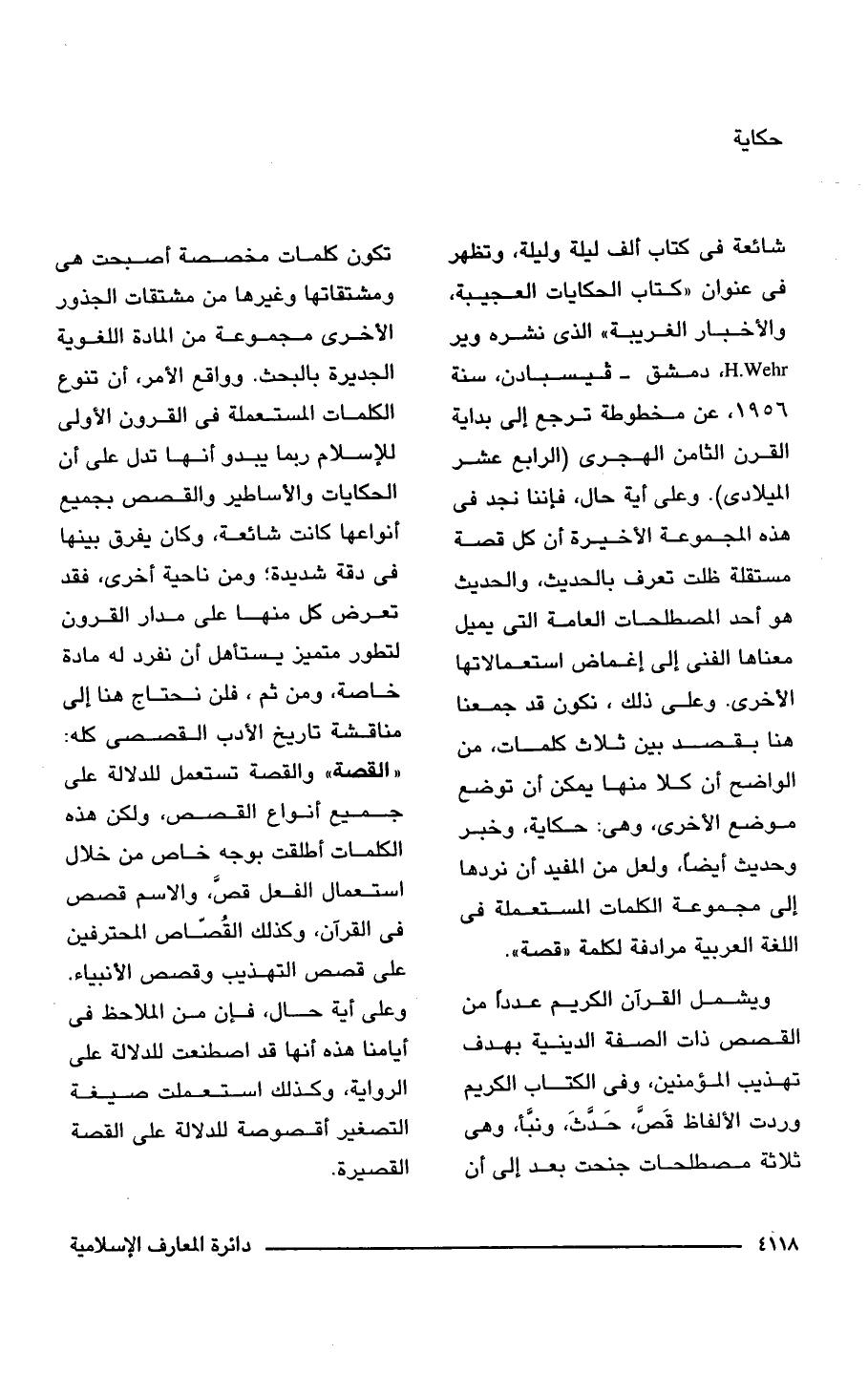 شائعة فى كتاب ألف ليلة وليلة، وتظهر فى عنوان "كتاب الحكايات العجيبة، والأخبار الغريبة" الذى نشره وير H.Wehr, دمشق - فيسبادن، سنة 1956، عن مخطوطة ترجع إلى بداية القرن الثامن الهجرى (الرابع عشر الميلادى). وعلى أية حال، فإننا نجد فى هذه المجموعة الأخيرة أن كل قصة مستقلة ظلت تعرف بالحديث، والحديث هو أحد المصطلحات العامة التى يميل معناها الفنى إلى إغماض استعمالاتها الأخرى. وعلى ذلك، نكون قد جمعنا هنا بقصد بين ثلاث كلمات، من الواضح أن كلا منها يمكن أن توضع موضع الأخرى، وهى: حكاية، وخبر وحديث أيضًا، ولعل من المفيد أن نردها إلى مجموعة الكلمات المستعملة فى اللغة العربية مرادفة لكلمة "قصة".