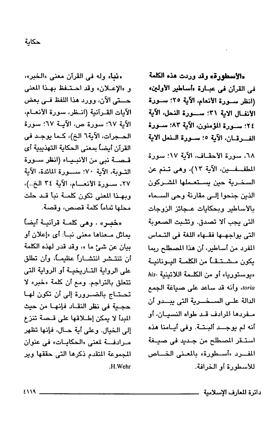 "الأسطورة" وقد وردت هذه الكلمة فى القرآن فى عبارة "أساطير الأولين" (انظر سورة الأنعام، الآية 25؛ سورة الأنفال الآية 31؛ سورة النحل، الآية 24؛ سورة المؤمنون، الآية 83؛ سورة الفرقان، الآية 5؛ سورة النمل الآية 68, سورة الأحقاف، الآية 17؛ سورة المطففين، الآية 13)، وهى تنم عن السخرية حين يستعملها المشركون الذين جنحوا إلى مقارنة وحى السماء بالأساطير وبحكايات عجائز الزوجات التى يجب ألا تصدق. وتثبت الصعوبة التى يواجهها فقهاء اللغة فى التماس المفرد من أساطير، أن هذا المصطلح ربما يكون مشتقًا من الكلمة اليونانية "يوستوريا" أو من الكلمة اللاتينية - his toria, وأنه قد ساعد على صياغة الجمع الدالة على السخرية التى يبدو أن مفردها المرادف قد طواه النسيان، أو أنه لم يوجد ألبتة. وفى أيامنا هذه استقر المصطلح من جديد فى صيغة المفرد "أسطورة" بالمعنى الخاص للأسطورة أو الخرافة.