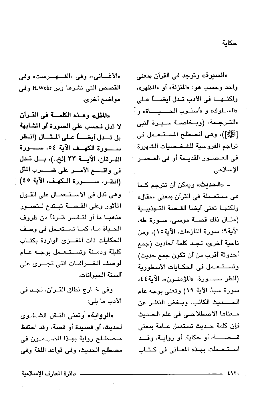 - "الحديث" ويمكن أن تترجم كما هى مستعملة فى القرآن بمعنى "مقال" ولكنها تعنى أيضًا القصة التهذيبية (مثال ذلك قصة موسى، سورة طه، الآية 9؛ سورة النازعات، الآية 15)، ومن ناحية أخرى، نجد كلمة أحاديث (جمع أحدوثة أقرب من أن تكون جمع حديث) وتستعمل فى الحكايات الأسطورية (انظر سورة، "المؤمنون"، الآية 44، سورة سبأ، الآية 19) وتعنى بوجه عام الحديث الكاذب. وبغض النظر عن معناها الاصطلاحى فى علم الحديث فإن كلمة حديث تستعمل عامة بمعنى قصة، أو حكاية، أو رواية، وقد استعملت بهذه المعانى فى كتاب "الأغانى"، وفى "الفهرست" وفى القصص التى نشرها وير H.Wehr وفى مواضع أخرى.