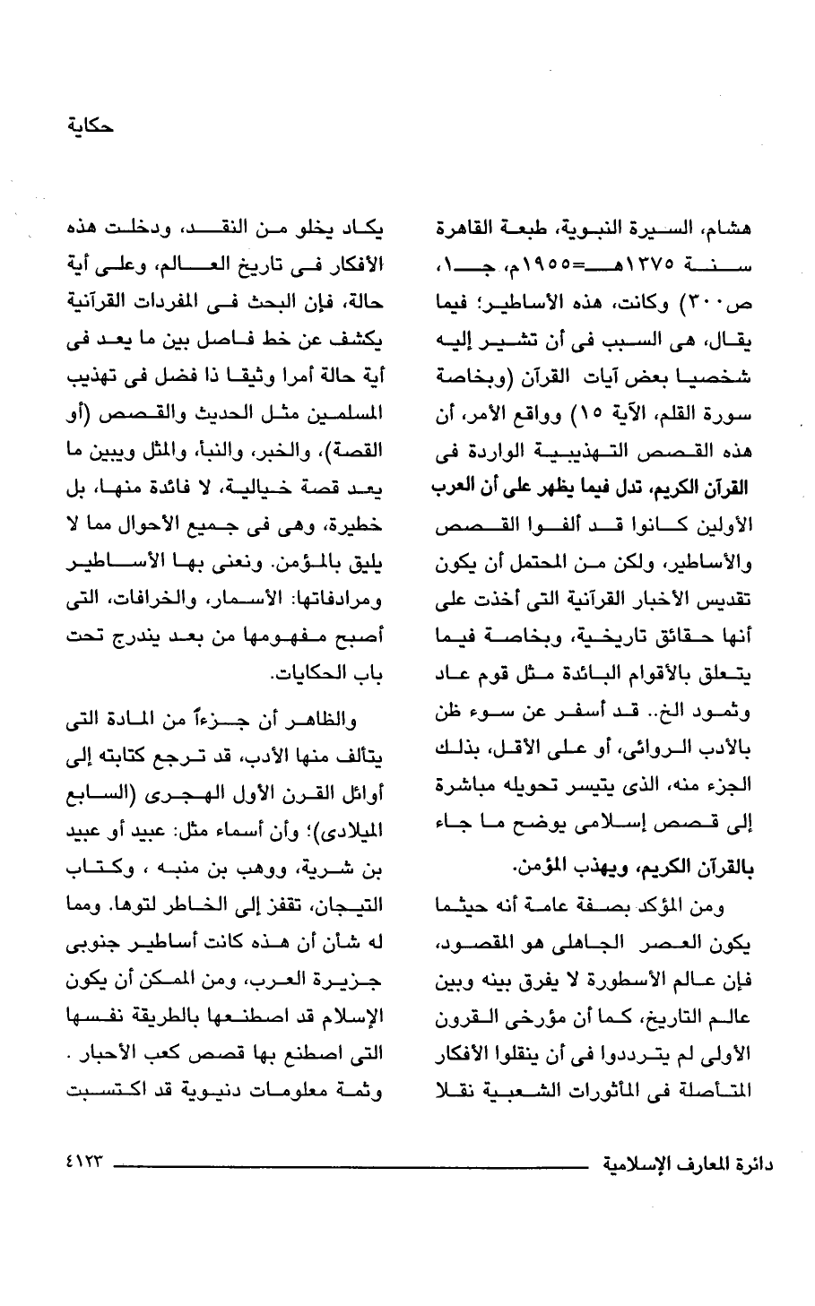 هشام، السيرة النبوية، طبعة القاهرة سنة 1375 هـ = 1955 م، جـ 1، ص 300) وكانت، هذه الأساطير؛ فيما يقال، هى السبب فى أن تشير إليه شخصيًا بعض آيات القرآن (وبخاصة سورة القلم، الآية 15) وواقع الأمر، أن هذه القصص التهذيبية الواردة فى القرآن الكريم، تدل فيما يظهر على أن العرب الأولين كانوا قد ألفوا القصص والأساطير، ولكن من المحتمل أن يكون تقديس الأخبار القرآنية التى أخذت على أنها حقائق تاريخية، وبخاصة فيما يتعلق بالأقوام البائدة مثل قوم عاد وثمود الخ .. قد أسفر عن سوء ظن بالأدب الروائى، أو على الأقل، بذلك الجزء منه، الذى يتيسر تحويله مباشرة إلى قصص إسلامى يوضح ما جاء بالقرآن الكريم، ويهذب المؤمن.